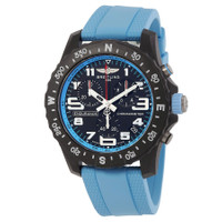 Black breitlight case with a blue rubber strap. Bi-directional rotating black bezel. Black dial with silver-tone hands and index-Arabic numeral hour markers. Minute markers around the outer rim. Dial Type: Analog. Luminescent hands and markers. Date display between 4 and 5 o'clock position. Chronograph - three sub-dials displaying: 60 second, 30 minute and 1/10th of a second. Breitling Calibre 82 quartz movement. Scratch resistant sapphire crystal. Screw down crown. Solid case back. Round case shape, case size: 44 mm, case thickness: 12.5 mm. Band width: 22 mm. Tang clasp. Water resistant at 100 meters / 330 feet. Functions: chronograph, date, hour, minute, second. Endurance Series. Sport watch style. Watch label: Swiss Made. Breitling Endurance Chronograph Quartz Black Dial Men's Watch X82310281B1S2. CASE Case Size: 44 Case Thickness: 12.5 mm Case Material: Breitlight Case Shape: Round Case Back: Solid BAND Band Material: Rubber Band Type: Strap Band Color: Blue Band Width: 22 mm Clasp: Tang DIAL Dial Color: Black Type: Analog Crystal: Scratch Resistant Sapphire Hands: Silver-tone Dial Markers: Index-Arabic Numeral Second Markers: Minute Markers around the outer rim Sub Dials: Three - 60 Second, 30 Minute and 1/10th of a Second Luminiscence: Hands and Markers Bezel: Bi-directional Rotating Bezel Color: Black Crown: Screw Down INFORMATION Brand: Breitling Series: Professional Collection Name: Endurance Gender: Mens Model: X82310281B1S2 Watch Label: Swiss Made Movement: Quartz Engine: Breitling Calibre 82 FEATURES Water Resistance: 100 meters / 330 feet Calendar: Date display between 4 and 5 o'clock position Functions: Chronograph, Date, Hour, Minute, Second Watch Features: Chronograph, Rubber, Analog ADDITIONAL INFO Watch Style: Sport Warranty: 2 Year Jomashop Warranty Jomashop Sku: BTX82310281B1S2 Department: Watches