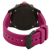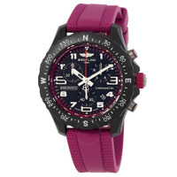 Black breitlight case with a purple rubber strap. Bi-directional rotating black bezel. Black dial with silver-tone hands and index-Arabic numeral hour markers. Minute markers around the outer rim. Dial Type: Analog. Luminescent hands and markers. Date display between 4 and 5 o'clock position. Chronograph - three sub-dials displaying: 60 second, 30 minute and 1/10th of a second. Breitling Calibre 83 quartz movement. Scratch resistant sapphire crystal. Screw down crown. Solid case back. Round case shape, case size: 38 mm, case thickness: 12.1 mm. Band width: 18 mm. Tang clasp. Water resistant at 100 meters / 330 feet. Functions: chronograph, date, hour, minute, second. Endurance Pro Series. Sport watch style. Watch label: Swiss Made. Breitling Endurance Pro Chronograph Quartz Black Dial Unisex Watch X83310F61B1S1. GENERAL Box Type: Original Box CASE Case Diameter: 38 mm Case Thickness: 12.1 mm Case Material: Breitlight Case Shape: Round Case Back: Solid BAND Band Material: Rubber Band Type: Strap Band Color: Purple Band Width: 18 mm Clasp: Tang DIAL Dial Color: Black Type: Analog Crystal: Scratch Resistant Sapphire Hands: Silver-tone Dial Markers: Index-Arabic Numeral Second Markers: Minute Markers around the outer rim Sub Dials: Three - 60 Second, 30 Minute and 1/10th of a Second Luminiscence: Hands and Markers Bezel: Bi-directional Rotating Bezel Color: Black Crown: Screw Down INFORMATION Brand: Breitling Series: Endurance Pro Collection Name: Endurance Pro Gender: Mens Model: X83310F61B1S1 Watch Label: Swiss Made Movement: Quartz Engine: Breitling Calibre 83 FEATURES Water Resistance: 100 meters / 330 feet Calendar: Date display between 4 and 5 o'clock position Functions: Chronograph, Date, Hour, Minute, Second Watch Features: Analog, Rubber, Chronograph ADDITIONAL INFO Watch Style: Sport Warranty: 2 Year Jomashop Warranty Jomashop Sku: BTX83310F61B1S1 Department: Watches Category: Watches