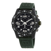 Black breitlight case with a green rubber strap. Bi-directional rotating black breitlight bezel. Black dial with silver-tone hands and Arabic numeral hour markers. Minute markers around the outer rim. Dial Type: Analog. Luminescent hands and markers. Date display between 4 and 5 o'clock position. Chronograph - three sub-dials displaying: 60 second, 30 minute and 1/10th of a second. Breitling Calibre 82 quartz movement. Scratch resistant sapphire crystal. Pull / push crown. Solid case back. Round case shape, case size: 44 mm, case thickness: 12.5 mm. Band width: 22 mm. Tang clasp. Water resistant at 100 meters / 330 feet. Functions: chronograph, date, hour, minute, second, chronometer. Endurance Pro Series. Sport watch style. Watch label: Swiss Made. Breitling Endurance Pro Chronograph Quartz Chronometer Black Dial Men's Watch X82310D31B1S1. GENERAL Box Type: Original Box CASE Case Size: 44 Case Thickness: 12.5 mm Case Material: Breitlight Case Shape: Round Case Back: Solid BAND Band Material: Rubber Band Type: Strap Band Color: Green Band Width: 22 mm Clasp: Tang DIAL Dial Color: Black Type: Analog Crystal: Scratch Resistant Sapphire Hands: Silver-tone Dial Markers: Arabic Numeral Second Markers: Minute Markers around the outer rim Sub Dials: Three - 60 Second, 30 Minute and 1/10th of a Second Luminiscence: Hands and Markers Bezel: Bi-directional Rotating Bezel Color: Black Bezel Material: Breitlight Crown: Pull / Push INFORMATION Brand: Breitling Series: Endurance Pro Collection Name: Endurance Pro Gender: Mens Model: X82310D31B1S1 Watch Label: Swiss Made Movement: Quartz Engine: Breitling Calibre 82 FEATURES Water Resistance: 100 meters / 330 feet Calendar: Date display between 4 and 5 o'clock position Functions: Chronograph, Date, Hour, Minute, Second, Chronometer Watch Features: Analog, Chronometer, Rubber, Chronograph ADDITIONAL INFO Watch Style: Sport Warranty: 2 Year Jomashop Warranty Jomashop Sku: BTX82310D31B1S1 Department: Watches Category: Watches