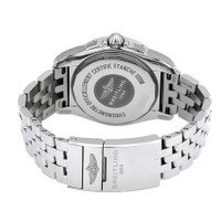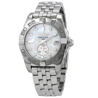 Stainless steel case with a stainless steel bracelet. Uni-directional rotating stainless steel bezel. Mother of pearl dial with luminous silver-tone hands and diamond hour markers. Index markers at the 6, 9 and 12 o'clock positions. Minute markers around the outer rim. Dial Type: Analog. Luminescent hands and markers. Date display at the 3 o'clock position. 60 seconds sub-dial. Breitling calibre 37 automatic movement, based upon ETA 2895-2, containing 27 Jewels, bitting at 28800 vph, and has a power reserve of approximately 42 hours. Scratch resistant sapphire crystal. Pull / push crown. Solid case back. Round case shape. Case size: 36 mm. Case thickness: 12.3 mm. Band width: 18 mm. Fold over clasp with a safety release. Water resistant at 100 meters / 330 feet. Functions: date, hour, minute, second. Dress watch style. Watch label: Swiss Made. Breitling Galactic 36 Automatic Diamond Ladies Watch A37330121A1A1. INFORMATION Brand: Breitling Series: Galactic 36 Collection Name: Galactic 36 Gender: Womens Model: A37330121A1A1 Watch Label: Swiss Made Movement: Automatic Engine: Breitling Calibre 37 Power Reserve: 42 hours CASE Case Size: 36 mm Case Thickness: 12.3 mm Case Material: Stainless Steel Case Shape: Round Case Back: Solid BAND Band Material: Stainless Steel Band Type: Bracelet Band Color: Silver-tone Band Width: 18 mm Clasp: Fold Over with Safety Release DIAL Dial Color: Mother of Pearl Type: Analog Crystal: Scratch Resistant Sapphire Hands: Luminous Silver-tone Dial Markers: Diamond Second Markers: Index Markers at the 6, 9 and 12 o'clock positions. Minute Markers around the outer rim Sub Dials: One - Small Second Luminiscence: Hands and Markers Bezel: Uni-directional Rotating Bezel Color: Silver-tone Bezel Material: Stainless Steel Crown: Pull / Push FEATURES Water Resistance: 100 meters / 330 feet Calendar: Date display at the 3 o'clock position Functions: Date, Hour, Minute, Second Watch Features: Diamond, Stainless Steel, Analog ADDITIONAL INFO Watch Style: Dress Warranty: 2 Year Jomashop Warranty Jomashop Sku: BTA37330121A1A1 Department: Watches Category: Smart Watch