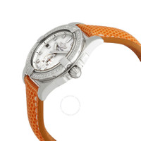 Silver-tone stainless steel case with a orange sahara leather strap. Fixed silver-tone bezel with diamond set. Mother of pearl dial with silver-tone hands and diamond hour markers. Index markers at the 6, 9 and 12 o'clock positions. Minute markers around the outer rim. Dial Type: Analog. Luminescent hands and markers. Date display at the 3 o'clock position. One subdial displaying: one- small seconds. Automatic movement. Scratch resistant sapphire crystal. Pull / push crown. Solid case back. Round case shape, case size: 36 mm. Tang clasp. Water resistant at 100 meters / 330 feet. Functions: date, hour, minute, second. Galactic 36 Series. Luxury watch style. Watch label: Swiss Made. Breitling Galactic 36 Automatic Diamond Ladies Watch A3733053/A717.118Z.A16BA.1. INFORMATION Brand: Breitling Series: Galactic 36 Collection Name: Galactic 36 Gender: Womens Model: A3733053/A717.118Z.A16BA.1 Watch Label: Swiss Made Movement: Automatic CASE Case Size: 36 mm Case Material: Stainless Steel Case Shape: Round Case Back: Solid BAND Band Material: Sahara Leather Band Type: Strap Band Color: Orange Clasp: Tang DIAL Dial Color: Mother of Pearl Type: Analog Crystal: Scratch Resistant Sapphire Hands: Silver-tone Dial Markers: Diamond Second Markers: Index markers at the 6, 9 and 12 o'clock positions. Minute Markers around the outer rim Sub Dials: One- Small Seconds Luminiscence: Hands and Markers Bezel: Fixed Bezel Color: Silver-tone Bezel Material: Diamond Set Crown: Pull / Push FEATURES Water Resistance: 100 meters / 330 feet Calendar: Date display at the 3 o'clock position Functions: Date, Hour, Minute, Second Watch Features: Diamond, Stainless Steel, Leather, Analog ADDITIONAL INFO Watch Style: Luxury Warranty: 2 Year Jomashop Warranty Jomashop Sku: BTA3733053A717118ZA1 Department: Watches Category: Watches
