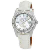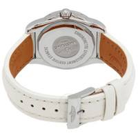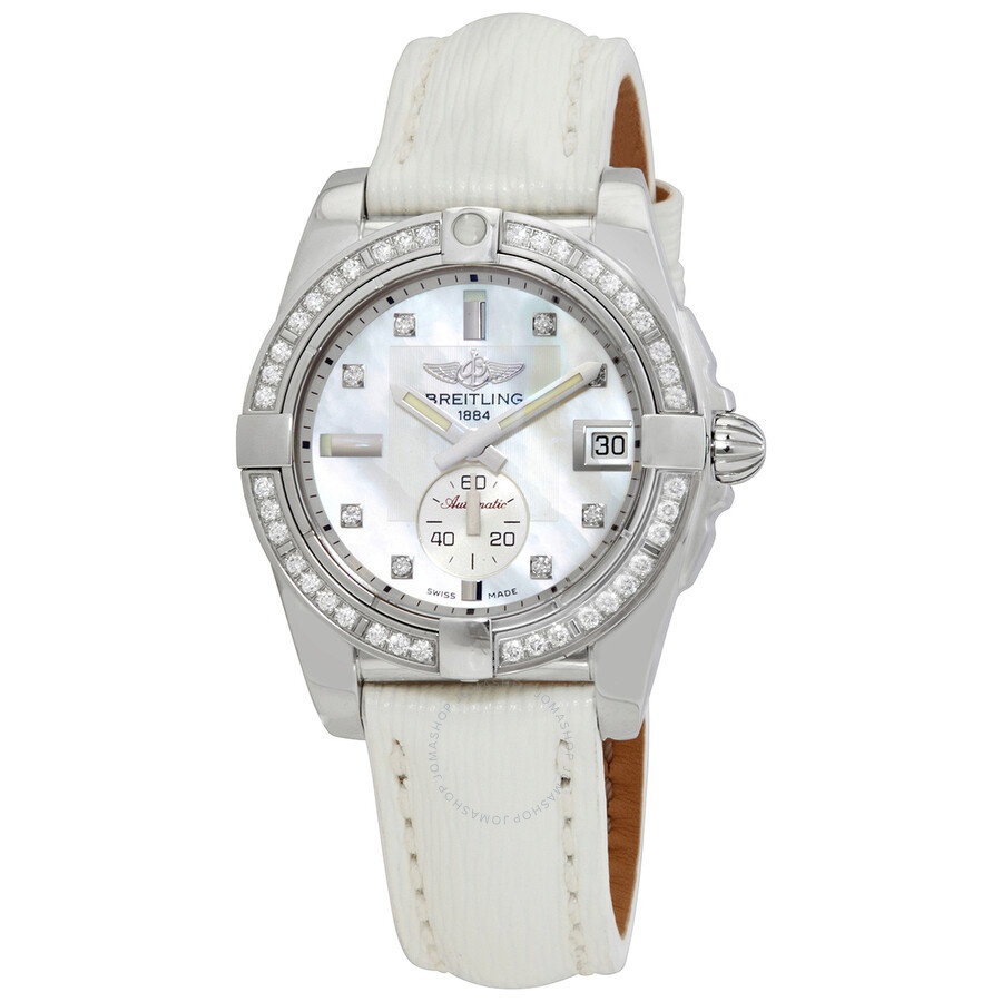 Silver-tone stainless steel case with a white sahara leather strap. Fixed bezel with diamond set. Mother of pearl dial with silver-tone hands and index-diamonds hour markers. Dial Type: Analog. Luminescent hands and markers. Date display at the 3 o'clock position. One subdial displaying: one- small seconds. Automatic movement. Scratch resistant sapphire crystal. Pull / push crown. Round case shape, case size: 36 mm. Water resistant at 100 meters / 330 feet. Functions: date, hour, minute, second. Galactic 36 Series. Luxury watch style. Watch label: Swiss Made. Breitling Galactic 36 Automatic Diamond Ladies Watch A3733053/A717.236X.A16BA.1. INFORMATION Brand: Breitling Series: Galactic 36 Collection Name: Galactic 36 Gender: Womens Model: A3733053/A717.236X.A16BA.1 Watch Label: Swiss Made Movement: Automatic CASE Case Size: 36 mm Case Material: Stainless Steel Case Shape: Round BAND Band Material: Sahara Leather Band Type: Strap Band Color: White Clasp: Tang DIAL Dial Color: Mother of Pearl Type: Analog Crystal: Scratch Resistant Sapphire Hands: Silver-tone Dial Markers: Index-Diamonds Sub Dials: One- Small Seconds Luminiscence: Hands and Markers Bezel: Fixed Bezel Material: Diamond Set Crown: Pull / Push FEATURES Water Resistance: 100 meters / 330 feet Calendar: Date display at the 3 o'clock position Functions: Date, Hour, Minute, Second Watch Features: Diamond, Stainless Steel, Leather, Analog ADDITIONAL INFO Watch Style: Luxury Warranty: 2 Year Jomashop Warranty Jomashop Sku: BTA3733053-A717WSLT Department: Watches Category: Watches