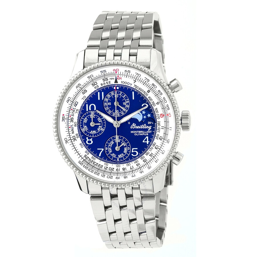 Silver-tone stainless steel case and bracelet. Bi-directional rotating slide rule silver-tone stainless steel bezel. Blue dial with silver-tone hands and luminous numbers hour markers. Slide rule markers around the outer rim. Dial Type: Analog. Luminescent hands and dial markers. Leap-year calendar. Four sub-dials displaying: 60 second/date, 30 minute/month, 12 hour/day of the week and moonphase. Breitling Calibre 19 Automatic movement, based upon ETA 2892-A2, containing 38 Jewels, bitting at 28800 vph, and has a power reserve of approximately 42 hours. Scratch resistant sapphire crystal. Screw in crown. Solid case back. Round case shape, case size: 42.10 mm, case thickness: 14.7 mm. Band width: 22 mm, band length: 8.5 inches. Hidden deployment clasp. Water resistant at 30 meters / 100 feet. Functions: chronograph, moonpase, month, date, day, hour, minute, second, chronometer. Additional Info: 42 hour power reserve, moonphase indicator, chronograph. Montbrilliant Olympus Series. Sport watch style. Watch label: Swiss Made. Breitling Montbrilliant Olympus Chronograph Automatic Chronometer Blue Dial Men's Watch A1935012/C667.442A. CASE Case Size: 42 Case Thickness: 14.7 mm Case Material: Stainless Steel Case Shape: Round Case Back: Solid BAND Band Material: Stainless Steel Band Type: Bracelet Band Color: Silver-tone Band Length: 8.5 inches Band Width: 22 mm Clasp: Hidden Deployment DIAL Dial Color: Blue Type: Analog Crystal: Scratch Resistant Sapphire Hands: Silver-tone Dial Markers: Luminous Numbers Second Markers: Slide Rule Markers around the outer rim Sub Dials: Four - 60 Second/Date, 30 Minute/Month, 12 Hour/Day of the Week and Moonphase Luminiscence: Hands and Dial Markers Bezel: Bi-directional Rotating Slide Rule Bezel Color: Silver-tone Bezel Material: Stainless Steel Crown: Screw In INFORMATION Brand: Breitling Series: Montbrilliant Olympus Collection Name: Montbrilliant Olympus Gender: Mens Model: A1935012/C667.442A Watch Label: Swiss Made Movement: Automatic Engine: Breitling Calibre 19 Power Reserve: 42 hours FEATURES Water Resistance: 30 meters / 100 feet Calendar: Leap-year Calendar Functions: Chronograph, Moonpase, Month, Date, Day, Hour, Minute, Second, Chronometer Watch Features: Analog, Chronograph, Stainless Steel, Month, Chronometer ADDITIONAL INFO Watch Style: Sport Warranty: 2 Year Jomashop Warranty Additional Info: 42 Hour Power Reserve, Moonphase Indicator, Chronograph Jomashop Sku: BTA1935012C667442A Department: Watches Category: Watches