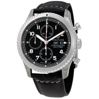 Stainless steel case with a black leather strap. Bi-directional rotating stainless steel bezel. Black dial with luminous rose-tone hands and Arabic numeral hour markers. Arabic numeral minute markers (at 5 minute intervals). Minute markers around the outer rim. Dial Type: Analog. Luminescent hands and markers. Day of the week and date display at the 3 o'clock position. Chronograph - three sub-dials displaying: 60 second, 30 minute and 12 hour. Breitling calibre 13 automatic movement, based upon ETA Valjoux 7750, containing 25 Jewels, bitting at 28800 vph, and has a power reserve of approximately 42 hours. Scratch resistant sapphire crystal. Screw locked crown. Solid case back. Round case shape. Case size: 43 mm. Case thickness: 14.17 mm. Band width: 23 mm. Tang clasp. Water resistant at 100 meters / 330 feet. Functions: chronograph, date, hour, minute, second, chronometer. Navitimer 8 Series. Luxury watch style. Watch label: Swiss Made. Item Variations: A1331410-BG69-487X-A20BASA.6. Breitling Navitimer 8 Chronograph Automatic Chronometer Black Dial Men's Watch A13314101B1X1. GENERAL Box Type: Original Box CASE Case Size: 43 Case Thickness: 14.17 mm Case Material: Stainless Steel Case Shape: Round Case Back: Solid BAND Band Material: Leather Band Type: Strap Band Color: Black Band Width: 23 mm Clasp: Tang DIAL Dial Color: Black Type: Analog Crystal: Scratch Resistant Sapphire Hands: Luminous Rose-tone Dial Markers: Arabic Numeral Second Markers: Arabic Numeral Minute Markers (at 5 minute intervals). Minute Markers around the outer rim Sub Dials: Three - 60 Second, 30 Minute and 12 Hour Luminiscence: Hands and Markers Bezel: Bi-Directional Rotating Bezel Color: Silver-tone Bezel Material: Stainless Steel Crown: Screw Locked INFORMATION Brand: Breitling Series: Navitimer Collection Name: Navitimer 8 Gender: Mens Model: A13314101B1X1 Watch Label: Swiss Made Movement: Automatic Engine: Breitling Calibre 13 Power Reserve: 42 hours FEATURES Water Resistance: 100 meters / 330 feet Calendar: Day of the Week and Date display at the 3 o'clock position Functions: Chronograph, Date, Hour, Minute, Second, Chronometer Watch Features: Analog, Chronometer, Leather, Stainless Steel, Chronograph ADDITIONAL INFO Watch Style: Luxury Warranty: 2 Year Jomashop Warranty Jomashop Sku: BTA13314101B1X1 Item Variation: A1331410-BG69-487X-A20BASA.6 Department: Watches Category: Watches