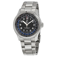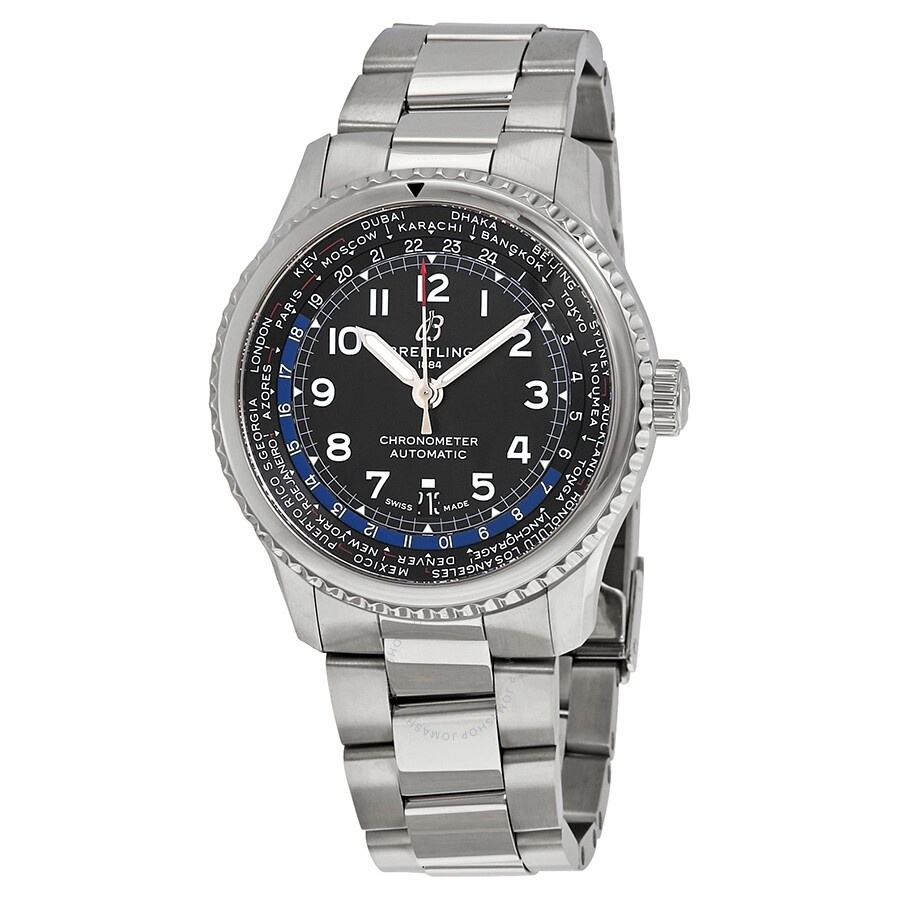 Stainless steel case with a stainless steel bracelet. Bi-directional rotating stainless steel bezel. Black dial with luminous silver-tone hands and Arabic numeral hour markers. Minute markers, 24 hour markings, world-time cities listed around the outer rim. Dial Type: Analog. Luminescent hands and markers. Date display at the 6 o'clock position. Breitling calibre 35 automatic movement, based upon ETA 2892-A2, containing 38 Jewels, bitting at 28800 vph, and has a power reserve of approximately 70 hours. Scratch resistant sapphire crystal. Screw locked crown. Transparent case back. Round case shape. Case size: 43 mm. Case thickness: 14.55 mm. Band width: 23 mm. Fold over clasp with a safety release. Water resistant at 100 meters / 330 feet. Functions: date, hour, minute, second, world time, 24 time zones. Navitimer 8 Unitime Series. Travel watch style. Watch label: Swiss Made. Item Variations: AB3521U4-BG85-188A. Breitling Navitimer 8 Unitime Automatic 43 mm Black Dial Men's Watch AB3521U41B1A1. INFORMATION Brand: Breitling Series: Navitimer 8 Unitime Collection Name: Navitimer 8 Unitime Gender: Mens Model: AB3521U41B1A1 Watch Label: Swiss Made Movement: Automatic Engine: Breitling Calibre 35 Power Reserve: 70 hours CASE Case Size: 43 mm Case Thickness: 14.55 mm Case Material: Stainless Steel Case Shape: Round Case Back: Transparent BAND Band Material: Stainless Steel Band Type: Bracelet Band Color: Silver-tone Band Width: 23 mm Clasp: Fold Over with Safety Release DIAL Dial Color: Black Type: Analog Crystal: Scratch Resistant Sapphire Hands: Luminous Silver-tone Dial Markers: Arabic Numeral Second Markers: Minute Markers, 24 Hour Markings, World-time Cities Listed around the outer rim Luminiscence: Hands and Markers Bezel: Bi-directional Rotating Bezel Color: Silver-tone Bezel Material: Stainless Steel Crown: Screw Locked FEATURES Water Resistance: 100 meters / 330 feet Calendar: Date display at the 6 o'clock position Functions: Date, Hour, Minute, Second, World time, 24 Time Zones Watch Features: Time Zone, Stainless Steel, World Time, Analog ADDITIONAL INFO Watch Style: Travel Warranty: 2 Year Jomashop Warranty Jomashop Sku: BTAB3521U41B1A1 Item Variation: AB3521U4-BG85-188A Department: Watches Category: Watches