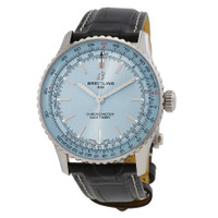 Silver-tone stainless steel case with a black leather strap. Bi-directional rotating silver-tone stainless steel bezel. Ice blue dial with silver-tone hands and index hour markers. Minute scale around the inner rim. Dial Type: Analog. Luminescent hands and markers. Breitling Calibre 17 Automatic movement, based upon ETA 2824-2, containing 25 Jewels, bitting at 28800 vph, and has a power reserve of approximately 42 hours. Scratch resistant sapphire crystal. Solid case back. Round case shape, case size: 41 mm, case thickness: 11.6 mm. Band width: 22 mm. Folding clasp. Water resistant at 30 meters / 100 feet. Functions: hour, minute, second. Navitimer Series. Sport watch style. Watch label: Swiss Made. Breitling Navitimer Automatic Men's Watch A17329171C1P1. CASE Case Size: 41 Case Thickness: 11.6 mm Case Material: Stainless Steel Case Shape: Round Case Back: Solid BAND Band Material: Alligator Leather Band Type: Strap Band Color: Black Band Width: 22 mm Clasp: Folding DIAL Dial Color: Ice Blue Type: Analog Crystal: Scratch Resistant Sapphire Hands: Silver-tone Dial Markers: Index Second Markers: Minute Scale around the inner rim Luminiscence: Hands and Markers Bezel: Bi-directional Rotating Bezel Color: Silver-tone Bezel Material: Stainless Steel INFORMATION Brand: Breitling Series: Navitimer Collection Name: Navitimer Gender: Mens Model: A17329171C1P1 Watch Label: Swiss Made Movement: Automatic Engine: Breitling Calibre 17 Power Reserve: 38 hours FEATURES Water Resistance: 30 meters / 100 feet Functions: Hour, Minute, Second Watch Features: Stainless Steel, Leather, Analog ADDITIONAL INFO Watch Style: Sport Warranty: 2 Year Jomashop Warranty Jomashop Sku: BTA17329171C1P1 Department: Watches