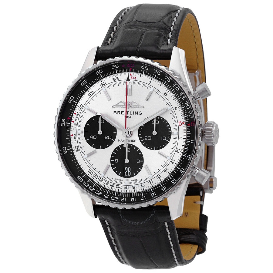 Gold-tone stainless steel case with a black (calfskin) leather strap. Bi-directional rotating silver-tone stainless steel bezel. Silver dial with luminous silver-tone hands and index hour markers. Minute markers. Slide rule markings around the outer rim. Dial Type: Analog. Luminescent hands and markers. Date display at the 6 o'clock position. Chronograph - three sub-dials displaying: 60 second, 30 minute and 12 hour. Breitling Calibre 01 Automatic movement, containing 47 Jewels, composed of 346 parts, bitting at 28800 vph, and has a power reserve of approximately 70 hours. Scratch resistant sapphire crystal. Pull / push crown. Transparent case back. Round case shape, case size: 43 mm, case thickness: 13.9 mm. Band width: 24 mm / 20 mm. Fold over clasp. Water resistant at 30 meters / 100 feet. Functions: chronograph, column wheel, date, hour, minute, second, chronometer. Additional Info: original box, manual (complete accessories). Navitimer B01 Series. Luxury watch style. Watch label: Swiss Made. Breitling Navitimer B01 Chronograph Automatic Chronometer White Dial Men's Watch AB0138241G1P1. INFORMATION Brand: Breitling Series: Navitimer B01 Collection Name: Navitimer B01 Gender: Mens Model: AB0138241G1P1 Watch Label: Swiss Made Movement: Automatic Engine: Breitling Calibre 01 Power Reserve: 70 hours CASE Case Size: 43 mm Case Thickness: 13.9 mm Case Material: Stainless Steel Case Shape: Round Case Back: Transparent BAND Band Material: (Calfskin) Leather Band Type: Strap Band Color: Black Band Width: 24 mm / 20 mm Clasp: Fold Over DIAL Dial Color: Silver Type: Analog Crystal: Scratch Resistant Sapphire Hands: Luminous Silver-tone Dial Markers: Index Second Markers: Minute Markers. Slide Rule Markings around the outer rim Sub Dials: Three - 60 Second, 30 Minute and 12 Hour Luminiscence: Hands and Markers Bezel: Bi-directional Rotating Bezel Color: Silver-tone Bezel Material: Stainless Steel Crown: Pull / Push FEATURES Water Resistance: 30 meters / 100 feet Calendar: Date display at the 6 o'clock position Functions: Chronograph, Column Wheel, Date, Hour, Minute, Second, Chronometer Watch Features: Analog, Chronometer, Gold, Leather, Stainless Steel, Chronograph ADDITIONAL INFO Watch Style: Luxury Warranty: 2 Year Jomashop Warranty Additional Info: Original Box, Manual (Complete Accessories) Jomashop Sku: BTAB0138241G1P1 Department: Watches Category: Watches