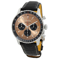 Stainless steel case with a black (alligator) leather strap. Bi-directional rotating stainless steel bezel. Copper dial with luminous silver-tone hands and index hour markers. Minute markers. Slide rule markings around the outer rim. Dial Type: Analog. Date display at the 6 o'clock position. Chronograph - three black sub-dials displaying: 60 second, 30 minute and 12 hours. Breitling 01 (manufacture) automatic movement with a 70-hour power reserve. Scratch resistant sapphire crystal. Pull / push crown. Transparent case back. Round case shape. Case size: 43 mm. Case thickness: 13.6 mm. Band width: 22 mm / 18 mm. Fold over clasp. Water resistant at 30 meters / 100 feet. Functions: chronograph, slide rule. date, hour, minute, second. Navitimer B01 Series. Luxury watch style. Watch label: Swiss Made. Breitling Navitimer B01 Chronograph Automatic Men's Watch AB0138241K1P1. INFORMATION Brand: Breitling Series: Navitimer B01 Collection Name: Navitimer B01 Gender: Mens Model: AB0138241K1P1 Watch Label: Swiss Made Movement: Automatic Engine: Breitling 01 (Manufacture) Power Reserve: 70 hours CASE Case Size: 43 mm Case Thickness: 13.6 mm Case Material: Stainless Steel Case Shape: Round Case Back: Transparent BAND Band Material: (Alligator) Leather Band Type: Strap Band Color: Black Band Width: 22 mm / 18 mm Clasp: Fold Over DIAL Dial Color: Copper Type: Analog Crystal: Scratch Resistant Sapphire Hands: Luminous Silver-tone Dial Markers: Index Second Markers: Minute Markers. Slide Rule Markings around the outer rim Sub Dials: Three - 60 Second, 30 Minute and 12 Hours Bezel: Bi-directional Rotating Bezel Color: Silver-tone Bezel Material: Stainless Steel Crown: Pull / Push FEATURES Water Resistance: 30 meters / 100 feet Calendar: Date display at the 6 o'clock position Functions: Chronograph, Slide Rule. Date, Hour, Minute, Second Watch Features: Chronograph, Stainless Steel, Leather, Analog, Alligator Leather ADDITIONAL INFO Watch Style: Luxury Warranty: 2 Year Jomashop Warranty Jomashop Sku: BTAB0138241K1P1 Department: Watches Category: Watches