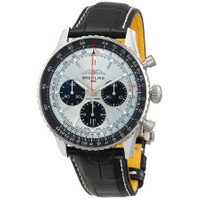 Silver-tone stainless steel case with a black alligator band. Bi-directional rotating silver-tone stainless steel bezel. Blue dial with silver-tone hands and index hour markers. Minute markers around the outer rim. Dial Type: Analog. Luminescent hands and markers. Date display at the 6 o'clock position. Chronograph - three sub-dials displaying: 60 second, 30 minute and 12 hour. Breitling Calibre 01 Automatic movement, containing 47 Jewels, composed of 346 parts, bitting at 28800 vph, and has a power reserve of approximately 70 hours. Scratch resistant sapphire crystal. Pull / push crown. Transparent see through case back. Round case shape, case size: 43 mm. Fold over clasp with a safety release. Water resistant at 30 meters / 100 feet. Functions: chronograph, column wheel, date, hour, minute, second, chronometer. Additional Info: original box, international warranty card, manual (complete accessories). Navitimer Series. Luxury watch style. Watch label: Swiss Made. Breitling Navitimer Chronograph Automatic Chronometer Blue Dial Men's Watch AB0138241C1P1. GENERAL Box Type: Original Box CASE Case Size: 43 Case Material: Stainless Steel Case Shape: Round Case Back: Transparent See Through BAND Band Material: Alligator Band Type: Strap Band Color: Black Clasp: Fold Over with Safety Release DIAL Dial Color: Blue Type: Analog Crystal: Scratch Resistant Sapphire Hands: Silver-tone Dial Markers: Index Second Markers: Minute Markers around the outer rim Sub Dials: Three - 60 Second, 30 Minute and 12 Hour Luminiscence: Hands and Markers Bezel: Bi-directional Rotating Bezel Color: Silver-tone Bezel Material: Stainless Steel Crown: Pull / Push INFORMATION Brand: Breitling Series: Navitimer Collection Name: Navitimer Gender: Mens Model: AB0138241C1P1 Watch Label: Swiss Made Movement: Automatic Engine: Breitling Calibre 01 Power Reserve: 70 hours FEATURES Water Resistance: 30 meters / 100 feet Calendar: Date display at the 6 o'clock position Functions: Chronograph, Column Wheel, Date, Hour, Minute, Second, Chronometer Watch Features: Alligator Leather, Analog, Chronometer, Stainless Steel, Chronograph ADDITIONAL INFO Watch Style: Luxury Warranty: 2 Year Jomashop Warranty Additional Info: Original Box, Manual (Complete Accessories) Jomashop Sku: BTAB0138241C1P1 Department: Watches Category: Watches