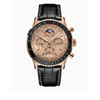 Rose gold-tone 18kt rose gold case with a black alligator band. Bi-directional rotating rose gold-tone 18kt rose gold bezel. Champagne dial with rose gold-tone hands and index hour markers. Minute markers around the outer rim. Dial Type: Analog. Luminescent hands and markers. Date display at the 3 o'clock position. Four sub-dials displaying: 60 second/date, 30 minute/month, 12 hour/day of the week and moonphase. Breitling Calibre 19 Automatic movement, based upon ETA 2892-A2, containing 38 Jewels, bitting at 28800 vph, and has a power reserve of approximately 42 hours. Scratch resistant sapphire crystal. Pull / push crown. Transparent see through case back. Round case shape, case size: 43 mm. Fold over clasp with a safety release. Water resistant at 30 meters / 100 feet. Functions: perpetual calendar, leap year, moon phase, chronograph, month, date, day, hour, minute, small second, chronometer. Additional Info: 140th anniversary. Navitimer Series. Casual watch style. Watch label: Swiss Made. Breitling Navitimer Perpetual Chronograph Automatic Chronometer Moon Phase Champagne Dial Men's Watch RB19101A1H1P1. CASE Case Size: 43 Case Material: 18kt Rose Gold Case Shape: Round Case Back: Transparent See Through BAND Band Material: Alligator Band Type: Strap Band Color: Black Clasp: Fold Over with Safety Release DIAL Dial Color: Champagne Type: Analog Crystal: Scratch Resistant Sapphire Hands: Rose Gold-tone Dial Markers: Index Second Markers: Minute Markers around the outer rim Sub Dials: Four - 60 Second/Date, 30 Minute/Month, 12 Hour/Day of the Week and Moonphase Luminiscence: Hands and Markers Bezel: Bi-directional Rotating Bezel Color: Rose Gold-tone Bezel Material: 18kt Rose Gold Crown: Pull / Push INFORMATION Brand: Breitling Series: Navitimer Collection Name: Navitimer Gender: Mens Model: RB19101A1H1P1 Watch Label: Swiss Made Movement: Automatic Engine: Breitling Calibre 19 Power Reserve: 42 hours FEATURES Water Resistance: 30 meters / 100 feet Calendar: Date display at the 3 o'clock position Functions: Perpetual Calendar, Leap Year, Moon Phase, Chronograph, Month, Date, Day, Hour, Minute, Small Second, Chronometer Watch Features: Alligator Leather, Analog, Leap Year Indicator, Chronometer, Month, Perpetual, Gold, Moon Phase, Chronograph ADDITIONAL INFO Watch Style: Casual Warranty: 2 Year Jomashop Warranty Additional Info: 140th Anniversary Jomashop Sku: BTRB19101A1H1P1 Department: Watches