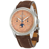 Stainless steel case with a brown leather strap. Fixed stainless steel bezel. Copper dial with luminous silver-tone hands and Arabic numeral hour markers. Minute markers. Arabic numeral minute markers (at 5 minute intervals). Tachymeter markings around the outer rim. Dial Type: Analog. Luminescent hands. Day of the week and month display below the 12 o'clock position. Chronograph - two sub-dials displaying: 60 second and 30 minute. Combination date / moonphase sub-dial. Breitling calibre 25 automatic movement, based upon ETA 2892-A2, containing 21 Jewels, bitting at 28800 vph, and has a power reserve of approximately 42 hours. Scratch resistant sapphire crystal. Pull / push crown. Transparent case back. Round case shape. Case size: 42 mm. Case thickness: 15.3 mm. Band width: 22 mm. Fold over clasp. Water resistant at 100 meters / 330 feet. Functions: chronograph, tachymeter, date, day, month, hour, minute, small second. Additional Info: original box, manual (complete accessories). Premier B25 Datora Series. Luxury watch style. Watch label: Swiss Made. Breitling Premier B25 Datora Chronograph Automatic Copper Dial Men's Watch AB2510201K1P1S. GENERAL Box Type: Original Box CASE Case Size: 42 Case Thickness: 15.3 mm Case Material: Stainless Steel Case Shape: Round Case Back: Transparent BAND Band Material: Leather Band Type: Strap Band Color: Brown Band Width: 22 mm Clasp: Fold Over DIAL Dial Color: Copper Type: Analog Crystal: Scratch Resistant Sapphire Hands: Luminous Silver-tone Dial Markers: Arabic Numeral Second Markers: Minute Markers. Arabic Numeral Minute Markers (at 5 minute intervals). Tachymeter Markings around the outer rim Sub Dials: Two - 60 Second and 30 Minute. Date / Moonphase Luminiscence: Hands Bezel: Fixed Bezel Color: Silver-tone Bezel Material: Stainless Steel Crown: Pull / Push INFORMATION Brand: Breitling Series: Premier Collection Name: Premier B25 Datora Gender: Mens Model: AB2510201K1P1S Watch Label: Swiss Made Movement: Automatic Engine: Breitling Calibre 25 Power Reserve: 42 hours FEATURES Water Resistance: 100 meters / 330 feet Calendar: Day of the Week and Month display below the 12 o'clock position Functions: Chronograph, Tachymeter, Date, Day, Month, Hour, Minute, Small Second Watch Features: Analog, Month, Leather, Stainless Steel, Chronograph ADDITIONAL INFO Watch Style: Luxury Warranty: 2 Year Jomashop Warranty Additional Info: Original Box, Manual (Complete Accessories) Jomashop Sku: BTAB2510201K1P1S Department: Watches Category: Watches