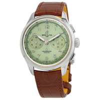 Stainless steel case with a brown leather strap. Fixed stainless steel bezel. Green dial with luminous silver-tone hands and Arabic numeral hour markers. Minute markers. Arabic numeral minute markers (at 5 minute intervals). Tachymeter markings around the outer rim. Dial Type: Analog. Luminescent hands and markers. Chronograph - two sub-dials displaying: 60 second and 30 minute. Breitling Calibre B09 hand wind movement with a 70-hour power reserve. Scratch resistant sapphire crystal. Pull / push crown. Transparent case back. Round case shape, case size: 40 mm, case thickness: 13 mm. Band width: 20 mm / 18 mm. Fold over clasp. Water resistant at 100 meters / 330 feet. Functions: chronograph, hour, minute, second. Premier Series. Dress watch style. Watch label: Swiss Made. Breitling Premier Chronograph Hand Wind Green Dial Men's Watch AB0930D31L1P1. INFORMATION Brand: Breitling Series: Premier Collection Name: Premier Gender: Mens Model: AB0930D31L1P1 Watch Label: Swiss Made Movement: Hand Wind Engine: Breitling Calibre B09 Power Reserve: 70 hours CASE Case Size: 40 mm Case Thickness: 13 mm Case Material: Stainless Steel Case Shape: Round Case Back: Transparent BAND Band Material: Leather Band Type: Strap Band Color: Brown Band Width: 20 mm / 18 mm Clasp: Fold Over DIAL Dial Color: Green Type: Analog Crystal: Scratch Resistant Sapphire Hands: Luminous Silver-tone Dial Markers: Arabic Numeral Second Markers: Minute Markers. Arabic Numeral Minute Markers (at 5 minute intervals). Tachymeter Markings around the outer rim Sub Dials: Two - 60 Second and 30 Minute Luminiscence: Hands and Markers Bezel: Fixed Bezel Material: Stainless Steel Crown: Pull / Push FEATURES Water Resistance: 100 meters / 330 feet Functions: Chronograph, Hour, Minute, Second Watch Features: Chronograph, Stainless Steel, Leather, Analog ADDITIONAL INFO Watch Style: Dress Warranty: 2 Year Jomashop Warranty Jomashop Sku: BTAB0930D31L1P1 Department: Watches Category: Watches