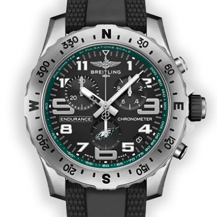 Grey titanium case with a black rubber strap. Bi-directional rotating grey titanium bezel. Black dial with silver-tone hands and Arabic numeral hour markers. Minute markers around the outer rim. Dial Type: Analog. Luminescent hands and markers. Date display between 4 and 5 o'clock position. Chronograph - three sub-dials displaying: 60 second, 30 minute and 1/10th of a second. Breitling Calibre 82 quartz movement. Scratch resistant sapphire crystal. Pull / push crown. Solid case back. Round case shape, case size: 42 mm. Fold over clasp with a safety release. Water resistant at 100 meters / 330 feet. Functions: chronograph, date, hour, minute, second, chronometer. Additional Info: nfl philadelphia eagles edition. Professional Series. Luxury watch style. Watch label: Swiss Made. Breitling Professional Chronograph Quartz Chronometer Black Dial Men's Watch E823106A1B6S1. GENERAL Box Type: Original Box CASE Case Diameter: 42 mm Case Material: Titanium Case Shape: Round Case Back: Solid BAND Band Material: Rubber Band Type: Strap Band Color: Black Clasp: Fold Over with Safety Release DIAL Dial Color: Black Type: Analog Crystal: Scratch Resistant Sapphire Hands: Silver-tone Dial Markers: Arabic Numeral Second Markers: Minute Markers around the outer rim Sub Dials: Three - 60 Second, 30 Minute and 1/10th of a Second Luminiscence: Hands and Markers Bezel: Bi-directional Rotating Bezel Color: Grey Bezel Material: Titanium Crown: Pull / Push INFORMATION Brand: Breitling Series: Professional Collection Name: Professional Gender: Mens Model: E823106A1B6S1 Watch Label: Swiss Made Movement: Quartz Engine: Breitling Calibre 82 FEATURES Water Resistance: 100 meters / 330 feet Calendar: Date display between 4 and 5 o'clock position Functions: Chronograph, Date, Hour, Minute, Second, Chronometer Watch Features: Analog, Chronometer, Rubber, Titanium, Chronograph ADDITIONAL INFO Watch Style: Luxury Warranty: 2 Year Jomashop Warranty Additional Info: NFL Philadelphia Eagles Edition Jomashop Sku: BTE823106A1B6S1 Department: Watches