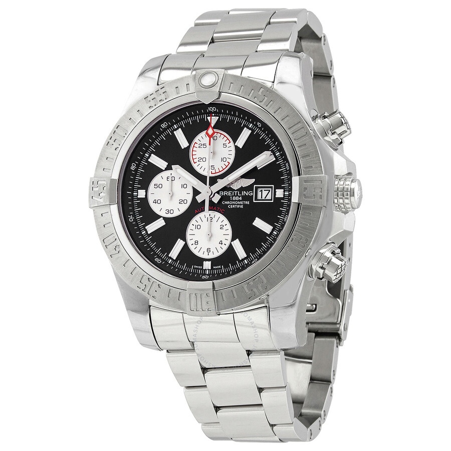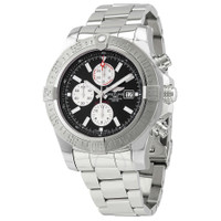 Stainless steel case with a stainless steel bracelet. Uni-directional rotating stainless steel bezel. Black dial with luminous silver-tone hands and index hour markers. Minute markers. 1/100th second scale around the outer rim. Dial Type: Analog. Luminescent hands and markers. Date display at the 3 o'clock position. Chronograph - three white sub-dials displaying: 60 second, 30 minute and 12 hour. Breitling calibre 13 automatic movement, based upon ETA Valjoux 7750, containing 25 Jewels, bitting at 28800 vph, and has a power reserve of approximately 42 hours. Scratch resistant sapphire crystal. Screw locked crown - two gaskets. Solid case back. Round case shape. Case size: 48 mm. Case thickness: 17.75 mm. Band width: 24 mm. Fold over clasp with a safety release. Water resistant at 300 meters / 1000 feet. Functions: chronograph, chronometer, date, hour, minute, second. Super Avenger II Series. Dive watch style. Watch label: Swiss Made. Breitling Super Avenger II Chronograph Automatic Chronometer Black Dial Men's Watch BC29/168A. GENERAL Box Type: Original Box CASE Case Size: 48 Case Thickness: 17.75 mm Case Material: Stainless Steel Case Shape: Round Case Back: Solid BAND Band Material: Stainless Steel Band Type: Bracelet Band Color: Silver-tone Band Width: 24 mm Clasp: Fold Over with Safety Release DIAL Dial Color: Black Type: Analog Crystal: Scratch Resistant Sapphire Hands: Luminous Silver-tone Dial Markers: Index Second Markers: Minute Markers. 1/100th Second scale around the outer rim Sub Dials: Three - 60 Second, 30 Minute and 12 Hour Luminiscence: Hands and Markers Bezel: Uni-directional Rotating Bezel Color: Silver-tone Bezel Material: Stainless Steel Crown: Screw Locked - Two Gaskets INFORMATION Brand: Breitling Series: Avenger Collection Name: Super Avenger II Gender: Mens Model: BC29/168A Watch Label: Swiss Made Movement: Automatic Engine: Breitling Calibre 13 Power Reserve: 42 hours FEATURES Water Resistance: 300 meters / 1000 feet Calendar: Date display at the 3 o'clock position Functions: Chronograph, Chronometer, Date, Hour, Minute, Second Watch Features: Analog, Chronometer, Stainless Steel, Chronograph ADDITIONAL INFO Watch Style: Dive Warranty: 2 Year Jomashop Warranty Jomashop Sku: BTBC29-168A Department: Watches Category: Watches