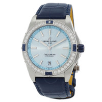 Silver-tone stainless steel case with a blue leather strap. Uni-directional rotating silver-tone bezel with diamond set. Ice blue dial with silver-tone hands and index hour markers. Arabic numeral minute markers (at 5 minute intervals). Dial Type: Analog. Luminescent hands and markers. Date display at the 6 o'clock position. Breitling Calibre 17 Automatic movement, based upon ETA 2824-2, containing 25 Jewels, bitting at 28800 vph, and has a power reserve of approximately 42 hours. Scratch resistant sapphire crystal. Pull / push crown. Solid case back. Round case shape, case size: 38 mm, case thickness: 11.8 mm. Band width: 20 mm. Deployment with push button release clasp. Water resistant at 100 meters / 330 feet. Functions: date, hour, minute, second, chronometer. Super Chronomat Series. Dress watch style. Watch label: Swiss Made. Breitling Super Chronomat Automatic Chronometer Diamond Ladies Watch A17356531C1P1. CASE Case Size: 38 Case Thickness: 11.8 mm Case Material: Stainless Steel Case Shape: Round Case Back: Solid BAND Band Material: Leather Band Type: Strap Band Color: Blue Band Width: 20 mm Clasp: Deployment with Push Button Release DIAL Dial Color: Ice Blue Type: Analog Crystal: Scratch Resistant Sapphire Hands: Silver-tone Dial Markers: Index Second Markers: Arabic Numeral Minute Markers (at 5 minute intervals) Luminiscence: Hands and Markers Bezel: Uni-directional Rotating Bezel Color: Silver-tone Bezel Material: Diamond Set Crown: Pull / Push INFORMATION Brand: Breitling Series: Chronomat Collection Name: Super Chronomat Gender: Womens Model: A17356531C1P1 Watch Label: Swiss Made Movement: Automatic Engine: Breitling Calibre 17 Power Reserve: 42 hours FEATURES Water Resistance: 100 meters / 330 feet Calendar: Date display at the 6 o'clock position Functions: Date, Hour, Minute, Second, Chronometer Watch Features: Analog, Chronometer, Leather, Stainless Steel, Diamond ADDITIONAL INFO Watch Style: Dress Warranty: 2 Year Jomashop Warranty Jomashop Sku: BTA17356531C1P1 Department: Watches Category: Watches