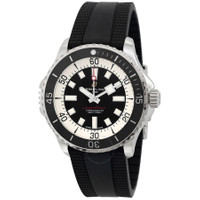 Silver-tone stainless steel case with a black rubber strap. Bi-directional rotating black stainless steel bezel. Black dial with silver-tone hands and index hour markers. Minute markers around the outer rim. Dial Type: Analog. Luminescent hands and markers. Breitling Calibre 17 Automatic movement, based upon ETA 2824-2, containing 25 Jewels, bitting at 28800 vph, and has a power reserve of approximately 42 hours. Scratch resistant sapphire crystal. Screw down crown. Solid case back. Round case shape, case size: 46 mm, case thickness: 13.2 mm. Band width: 24/20 mm. Folding clasp. Water resistant at 300 meters / 1000 feet. Functions: date, hour, minute, second, chronometer. Superocean Series. Dive watch style. Watch label: Swiss Made. Breitling Superocean Automatic Chronometer Black Dial Men's Watch A17378211B1S1. INFORMATION Brand: Breitling Series: Superocean Collection Name: Superocean Gender: Mens Model: A17378211B1S1 Watch Label: Swiss Made Movement: Automatic Engine: Breitling Calibre 17 Power Reserve: 42 hours CASE Case Size: 46 mm Case Thickness: 13.2 mm Case Material: Stainless Steel Case Shape: Round Case Back: Solid BAND Band Material: Rubber Band Type: Strap Band Color: Black Band Width: 24/20 mm Clasp: Folding DIAL Dial Color: Black Type: Analog Crystal: Scratch Resistant Sapphire Hands: Silver-tone Dial Markers: Index Second Markers: Minute Markers around the outer rim Luminiscence: Hands and Markers Bezel: Bi-directional Rotating Bezel Color: Black Bezel Material: Stainless Steel Crown: Screw Down FEATURES Water Resistance: 300 meters / 1000 feet Functions: Date, Hour, Minute, Second, Chronometer Watch Features: Stainless Steel, Rubber, Chronometer, Analog ADDITIONAL INFO Watch Style: Dive Warranty: 2 Year Jomashop Warranty Jomashop Sku: BTA17378211B1S1 Department: Watches Category: Watches