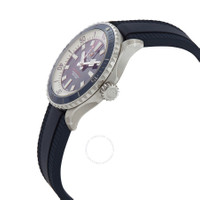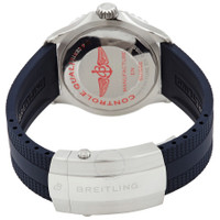 Silver-tone stainless steel case with a blue rubber strap. Uni-directional rotating silver-tone stainless steel bezel with an inlaid blue ring. Blue dial with silver-tone hands and index hour markers. Minute markers around the outer rim. Dial Type: Analog. Luminescent hands and markers. Breitling Calibre 17 Automatic movement, based upon ETA 2824-2, containing 25 Jewels, bitting at 28800 vph, and has a power reserve of approximately 42 hours. Scratch resistant sapphire crystal. Screw down crown. Solid case back. Round case shape, case size: 42 mm, case thickness: 12.5 mm. Band width: 22/18 mm. Folding clasp. Water resistant at 300 meters / 1000 feet. Functions: hour, minute, second, chronometer. Superocean Series. Sport watch style. Watch label: Swiss Made. Breitling Superocean Automatic Chronometer Blue Dial Men's Watch A17375E71C1S1. INFORMATION Brand: Breitling Series: Superocean Collection Name: Superocean Gender: Mens Model: A17375E71C1S1 Watch Label: Swiss Made Movement: Automatic Engine: Breitling Calibre 17 Power Reserve: 42 hours CASE Case Size: 42 mm Case Thickness: 12.5 mm Case Material: Stainless Steel Case Shape: Round Case Back: Solid BAND Band Material: Rubber Band Type: Strap Band Color: Blue Band Width: 22/18 mm Clasp: Folding DIAL Dial Color: Blue Type: Analog Crystal: Scratch Resistant Sapphire Hands: Silver-tone Dial Markers: Index Second Markers: Minute Markers around the outer rim Luminiscence: Hands and Markers Bezel: Uni-directional Rotating Bezel Color: Silver-tone Bezel Material: Stainless Steel with an inlaid Blue Ring Crown: Screw Down FEATURES Water Resistance: 300 meters / 1000 feet Functions: Hour, Minute, Second, Chronometer Watch Features: Stainless Steel, Rubber, Chronometer, Analog ADDITIONAL INFO Watch Style: Sport Warranty: 2 Year Jomashop Warranty Jomashop Sku: BTA17375E71C1S1 Department: Watches Category: Watches