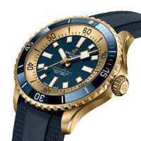 Bronze case with a blue rubber strap. Uni-directional rotating blue ceramic bezel. Blue dial with gold-tone hands and index hour markers. Minute markers around the outer rim. Dial Type: Analog. Breitling Calibre 17 Automatic movement, based upon ETA 2824-2, containing 25 Jewels, bitting at 28800 vph, and has a power reserve of approximately 42 hours. Scratch resistant sapphire crystal. Screw down crown. Solid case back. Round case shape, case size: 44 mm, case thickness: 12.62 mm. Band width: 22/18 mm. Folding clasp. Water resistant at 300 meters / 1000 feet. Functions: date, hour, minute, second, chronometer. Superocean Series. Dive watch style. Watch label: Swiss Made. Breitling Superocean Automatic Chronometer Blue Dial Watch N173761A1C1S1. GENERAL Box Type: Original Box CASE Case Thickness: 12.62 mm Case Material: Bronze Case Shape: Round Case Back: Solid BAND Band Material: Rubber Band Type: Strap Band Color: Blue Band Width: 22/18 mm Clasp: Folding DIAL Dial Color: Blue Type: Analog Crystal: Scratch Resistant Sapphire Hands: Gold-tone Dial Markers: Index Second Markers: Minute Markers around the outer rim Bezel: Uni-directional Rotating Bezel Color: Blue Bezel Material: Ceramic Crown: Screw Down INFORMATION Brand: Breitling Series: Superocean Collection Name: Superocean Gender: Mens Model: N173761A1C1S1 Watch Label: Swiss Made Movement: Automatic Engine: Breitling Calibre 17 Power Reserve: 42 hours FEATURES Water Resistance: 300 meters / 1000 feet Functions: Date, Hour, Minute, Second, Chronometer Watch Features: Analog, Chronometer, Ceramic, Gold, Rubber ADDITIONAL INFO Watch Style: Dive Warranty: 2 Year Jomashop Warranty Jomashop Sku: BTN173761A1C1S1 Department: Watches
