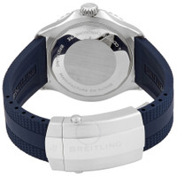 Silver-tone stainless steel case with a blue rubber strap. Uni-directional rotating silver-tone stainless steel bezel with an inlaid blue ring. Silver dial with blue hands and index hour markers. Minute markers around the outer rim. Dial Type: Analog. Luminescent hands and markers. Breitling Calibre 17 Automatic movement, based upon ETA 2824-2, containing 25 Jewels, bitting at 28800 vph, and has a power reserve of approximately 42 hours. Scratch resistant sapphire crystal. Screw down crown. Solid case back. Round case shape, case size: 42 mm, case thickness: 12.5 mm. Band width: 22/18 mm. Folding clasp. Water resistant at 300 meters / 1000 feet. Functions: hour, minute, second, chronometer. Superocean Series. Luxury watch style. Watch label: Swiss Made. Breitling Superocean Automatic Chronometer Silver Dial Men's Watch A17375E71G1S1. INFORMATION Brand: Breitling Series: Superocean Collection Name: Superocean Gender: Mens Model: A17375E71G1S1 Watch Label: Swiss Made Movement: Automatic Engine: Breitling Calibre 17 Power Reserve: 42 hours CASE Case Size: 42 mm Case Thickness: 12.5 mm Case Material: Stainless Steel Case Shape: Round Case Back: Solid BAND Band Material: Rubber Band Type: Strap Band Color: Blue Band Width: 22/18 mm Clasp: Folding DIAL Dial Color: Silver Type: Analog Crystal: Scratch Resistant Sapphire Hands: Blue Dial Markers: Index Second Markers: Minute Markers around the outer rim Luminiscence: Hands and Markers Bezel: Uni-directional Rotating Bezel Color: Silver-tone Bezel Material: Stainless Steel with an inlaid Blue Ring Crown: Screw Down FEATURES Water Resistance: 300 meters / 1000 feet Functions: Hour, Minute, Second, Chronometer Watch Features: Stainless Steel, Rubber, Chronometer, Analog ADDITIONAL INFO Watch Style: Luxury Warranty: 2 Year Jomashop Warranty Jomashop Sku: BTA17375E71G1S1 Department: Watches Category: Watches