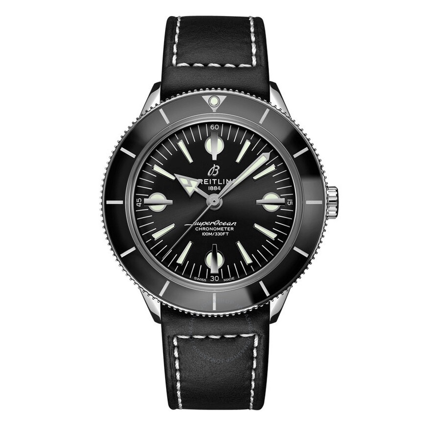 Silver-tone stainless steel case with a black calfskin leather strap. Bi-directional rotating silver-tone stainless steel bezel with a black ceramic ring. Black dial with silver-tone hands and index hour markers. Minute markers around the outer rim. Dial Type: Analog. Luminescent hands and markers. Breitling Calibre 10 Automatic movement, based upon ETA 2892-A2, containing 21 Jewels, bitting at 28800 vph, and has a power reserve of approximately 42 hours. Scratch resistant sapphire crystal. Solid case back. Round case shape, case size: 42 mm. Band width: 20/18 mm. Folding clasp. Water resistant at 100 meters / 330 feet. Functions: hour, minute, second. Superocean Heritage 57 Series. Luxury watch style. Watch label: Swiss Made. Breitling Superocean Heritage 57 Automatic Black Dial Men's Watch A10370121B1X2. GENERAL Box Type: Original Box CASE Case Size: 42 Case Material: Stainless Steel Case Shape: Round Case Back: Solid BAND Band Material: Calfskin Leather Band Type: Strap Band Color: Black Band Width: 20/18 mm Clasp: Folding DIAL Dial Color: Black Type: Analog Crystal: Scratch Resistant Sapphire Hands: Silver-tone Dial Markers: Index Second Markers: Minute Markers around the outer rim Luminiscence: Hands and Markers Bezel: Bi-directional Rotating Bezel Color: Silver-tone Bezel Material: Stainless Steel with a Black Ceramic Ring INFORMATION Brand: Breitling Series: Superocean Heritage Collection Name: Superocean Heritage 57 Gender: Mens Model: A10370121B1X2 Watch Label: Swiss Made Movement: Automatic Engine: Breitling Calibre 10 Power Reserve: 42 hours FEATURES Water Resistance: 100 meters / 330 feet Functions: Hour, Minute, Second Watch Features: Analog, Ceramic, Leather, Stainless Steel ADDITIONAL INFO Watch Style: Luxury Warranty: 2 Year Jomashop Warranty Jomashop Sku: BTA10370121B1X2 Department: Watches Category: Watches