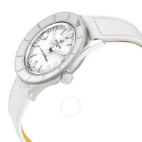 Stainless steel case with a white (calfskin) leather strap. Bi-directional rotating stainless steel bezel with an inlaid white ceramic ring. White dial with luminous silver-tone hands and index hour markers. Minute markers around the outer rim. Dial Type: Analog. Luminescent hands and markers. Breitling calibre 10 automatic movement, based upon ETA 2892-A2, containing 21 Jewels, bitting at 28800 vph, and has a power reserve of approximately 42 hours. Scratch resistant sapphire crystal. Pull / push crown. Solid case back. Round case shape. Case size: 38 mm. Case thickness: 9.2 mm. Band width: 18 mm / 16 mm. Fold over clasp. Water resistant at 100 meters / 330 feet. Functions: hour, minute, second. Superocean Heritage Series. Casual watch style. Watch label: Swiss Made. Breitling Superocean Heritage Automatic White Dial Ladies Watch A10340A71A1X1. INFORMATION Brand: Breitling Series: Superocean Heritage Collection Name: Superocean Heritage Gender: Womens Model: A10340A71A1X1 Watch Label: Swiss Made Movement: Automatic Engine: Breitling Calibre 10 Power Reserve: 42 hours CASE Case Size: 38 mm Case Thickness: 9.2 mm Case Material: Stainless Steel Case Shape: Round Case Back: Solid BAND Band Material: (Calfskin) Leather Band Type: Strap Band Color: White Band Width: 18 mm / 16 mm Clasp: Fold Over DIAL Dial Color: White Type: Analog Crystal: Scratch Resistant Sapphire Hands: Luminous Silver-tone Dial Markers: Index Second Markers: Minute Markers around the outer rim Luminiscence: Hands and Markers Bezel: Bi-directional Rotating Bezel Color: Silver-tone Bezel Material: Stainless Steel with an inlaid White Ceramic Ring Crown: Pull / Push FEATURES Water Resistance: 100 meters / 330 feet Functions: Hour, Minute, Second Watch Features: Stainless Steel, Leather, Ceramic, Analog ADDITIONAL INFO Watch Style: Casual Warranty: 2 Year Jomashop Warranty Jomashop Sku: BTA10340A71A1X1 Department: Watches Category: Watches