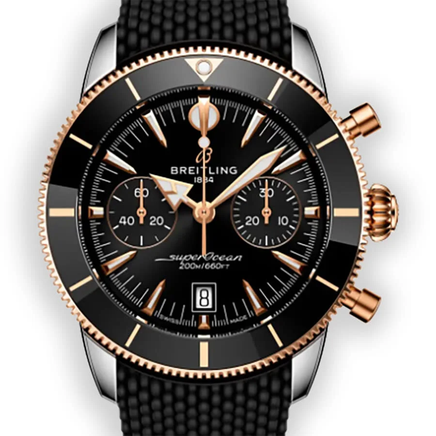 Silver-tone stainless steel case with a black rubber strap. Uni-directional rotating black 18kt rose gold bezel. Black dial with rose gold-tone hands and index hour markers. Minute markers around the outer rim. Dial Type: Analog. Luminescent hands and markers. Date display at the 6 o'clock position. Chronograph - three sub-dials displaying: 60 second, 30 minute and 12 hour. Breitling Calibre 01 Automatic movement, containing 47 Jewels, composed of 346 parts, bitting at 28800 vph, and has a power reserve of approximately 70 hours. Scratch resistant sapphire crystal. Screw down crown. Transparent see through case back. Round case shape, case size: 42 mm. Fold over clasp with a safety release. Water resistant at 200 meters / 660 feet. Functions: chronograph, column wheel, date, hour, minute, second, chronometer. Superocean Heritage Series. Luxury watch style. Watch label: Swiss Made. Breitling Superocean Heritage Chronograph Automatic Chronometer Black Dial Men's Watch UB0156H11B1S1. GENERAL Box Type: Original Box CASE Case Diameter: 42 mm Case Material: Stainless Steel Case Shape: Round Case Back: Transparent See Through BAND Band Material: Rubber Band Type: Strap Band Color: Black Clasp: Fold Over with Safety Release DIAL Dial Color: Black Type: Analog Crystal: Scratch Resistant Sapphire Hands: Rose Gold-tone Dial Markers: Index Second Markers: Minute Markers around the outer rim Sub Dials: Three - 60 Second, 30 Minute and 12 Hour Luminiscence: Hands and Markers Bezel: Uni-directional Rotating Bezel Color: Black Bezel Material: 18kt Rose Gold Crown: Screw Down INFORMATION Brand: Breitling Series: Superocean Heritage Collection Name: Superocean Heritage Gender: Mens Model: UB0156H11B1S1 Watch Label: Swiss Made Movement: Automatic Engine: Breitling Calibre 01 Power Reserve: 70 hours FEATURES Water Resistance: 200 meters / 660 feet Calendar: Date display at the 6 o'clock position Functions: Chronograph, Column Wheel, Date, Hour, Minute, Second, Chronometer Watch Features: Analog, Chronometer, Gold, Rubber, Stainless Steel, Chronograph ADDITIONAL INFO Watch Style: Luxury Warranty: 2 Year Jomashop Warranty Jomashop Sku: BTUB0156H11B1S1 Department: Watches
