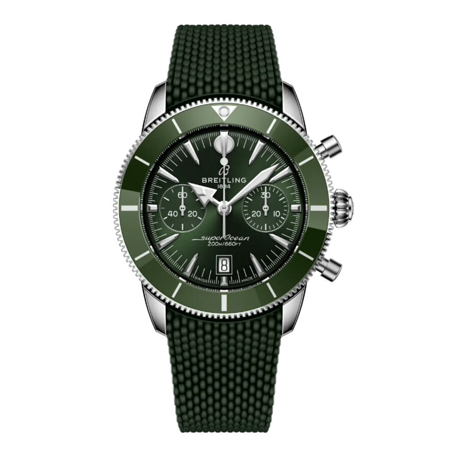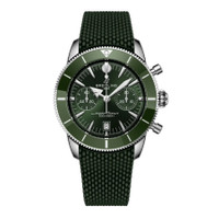 Silver-tone stainless steel case with a green rubber strap. Uni-directional rotating green stainless steel bezel. Green dial with silver-tone hands and index hour markers. Minute markers around the outer rim. Dial Type: Analog. Luminescent hands and markers. Date display at the 6 o'clock position. Chronograph - three sub-dials displaying: 60 second, 30 minute and 12 hour. Breitling Calibre 01 Automatic movement, containing 47 Jewels, composed of 346 parts, bitting at 28800 vph, and has a power reserve of approximately 70 hours. Scratch resistant sapphire crystal. Screw down crown. Transparent see through case back. Round case shape, case size: 42 mm. Deployment with push button release clasp. Water resistant at 200 meters / 660 feet. Functions: chronograph, column wheel, date, hour, minute, second, chronometer. Superocean Heritage Series. Luxury watch style. Watch label: Swiss Made. Breitling Superocean Heritage Chronograph Automatic Chronometer Green Dial Men's Watch AB0156361L1S1. GENERAL Box Type: Original Box CASE Case Material: Stainless Steel Case Shape: Round Case Back: Transparent See Through BAND Band Material: Rubber Band Type: Strap Band Color: Green Clasp: Deployment with Push Button Release DIAL Dial Color: Green Type: Analog Crystal: Scratch Resistant Sapphire Hands: Silver-tone Dial Markers: Index Second Markers: Minute Markers around the outer rim Sub Dials: Three - 60 Second, 30 Minute and 12 Hour Luminiscence: Hands and Markers Bezel: Uni-directional Rotating Bezel Color: Green Bezel Material: Stainless Steel Crown: Screw Down INFORMATION Brand: Breitling Series: Superocean Heritage Collection Name: Superocean Heritage Gender: Mens Model: AB0156361L1S1 Watch Label: Swiss Made Movement: Automatic Engine: Breitling Calibre 01 Power Reserve: 70 hours FEATURES Water Resistance: 200 meters / 660 feet Calendar: Date display at the 6 o'clock position Functions: Chronograph, Column Wheel, Date, Hour, Minute, Second, Chronometer Watch Features: Analog, Chronometer, Rubber, Stainless Steel, Chronograph ADDITIONAL INFO Watch Style: Luxury Warranty: 2 Year Jomashop Warranty Jomashop Sku: BTAB0156361L1S1 Department: Watches