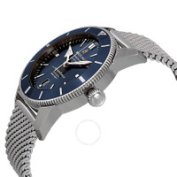 Stainless steel case with a stainless steel mesh bracelet. Uni-directional rotating coin edge stainless steel bezel with a blue ceramic (count-up elapsed time) top ring. Blue dial with luminous silver-tone arrow-shaped hands and index hour markers. Minute markers around the outer rim. Dial Type: Analog. Luminescent hands and markers. Date display at the o'clock position. Breitling calibre 20 automatic movement, based upon Tudor MT5612, containing 28 Jewels, bitting at 28800 vph, and has a power reserve of approximately 70 hours. Scratch resistant sapphire crystal. Screw locked crown. Solid case back. Round case shape. Case size: 46 mm. Case thickness: 15 mm. Band width: 24 mm. Fold over clasp with a safety release. Water resistant at 200 meters / 660 feet. Functions: date, hour, minute, second. Superocean Heritage II Series. Luxury watch style. Watch label: Swiss Made. Item Variations: AB202016-C961-152A. Breitling Superocean Heritage II Automatic 46 mm Blue Dial Men's Watch AB2020161C1A1. INFORMATION Brand: Breitling Series: Superocean Heritage Ii Collection Name: Superocean Heritage II Gender: Mens Model: AB2020161C1A1 Watch Label: Swiss Made Movement: Automatic Engine: Breitling Calibre 20 Power Reserve: 70 hours CASE Case Size: 46 mm Case Thickness: 15 mm Case Material: Stainless Steel Case Shape: Round Case Back: Solid BAND Band Material: Stainless Steel Mesh Band Type: Bracelet Band Color: Silver-tone Band Width: 24 mm Clasp: Fold Over with Safety Release DIAL Dial Color: Blue Type: Analog Crystal: Scratch Resistant Sapphire Hands: Luminous Silver-tone Arrow-shaped Dial Markers: Index Second Markers: Minute Markers around the outer rim Luminiscence: Hands and Markers Bezel: Uni-directional Rotating Coin Edge Bezel Color: Silver-tone Bezel Material: Stainless Steel with a Blue Ceramic (Count-Up Elapsed Time) Top Ring Crown: Screw Locked FEATURES Water Resistance: 200 meters / 660 feet Calendar: Date display at the o'clock position Functions: Date, Hour, Minute, Second Watch Features: Stainless Steel, Ceramic, Analog ADDITIONAL INFO Watch Style: Luxury Warranty: 2 Year Jomashop Warranty UPC Code: 842047143711 Jomashop Sku: BTAB2020161C1A1 Item Variation: AB202016-C961-152A Department: Watches Category: Watches