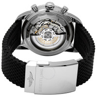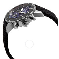 Stainless steel case with a black rubber (aero classic) strap. Uni-directional rotating stainless steel bezel with a black ceramic top ring. Blue dial with luminous silver-tone arrow-shaped hands and index hour markers. Minute markers around the outer rim. Dial Type: Analog. Luminescent hands and markers. Date display between the 4 and 5 o'clock positions. Chronograph - three sub-dials displaying: 60 second, 30 minute and 12 hours. Breitling calibre 01 automatic movement, containing 47 Jewels, composed of 346 parts, bitting at 28800 vph, and has a power reserve of approximately 70 hours. Scratch resistant sapphire crystal. Screw locked crown. Solid case back. Round case shape. Case size: 44 mm. Case thickness: 15.50 mm. Band width: 22 mm / 20 mm. Fold over clasp with a safety release. Water resistant at 200 meters / 660 feet. Functions: chronograph, column wheel, date, hour, minute, second, chronometer. Luxury watch style. Watch label: Swiss Made. Breitling Superocean Heritage II Chronograph Automatic Blue Dial Men's Watch AB0162121C1S1. GENERAL Box Type: Original Box CASE Case Size: 44 Case Thickness: 15.50 mm Case Material: Stainless Steel Case Shape: Round Case Back: Solid BAND Band Material: Rubber (Aero Classic) Band Type: Strap Band Color: Black Band Width: 22 mm / 20 mm Clasp: Fold Over with Safety Release DIAL Dial Color: Blue Type: Analog Crystal: Scratch Resistant Sapphire Hands: Luminous Silver-tone Arrow-shaped Dial Markers: Index Second Markers: Minute Markers around the outer rim Sub Dials: Three - 60 Second, 30 Minute and 12 Hour Luminiscence: Hands and Markers Bezel: Uni-directional Rotating Bezel Color: Silver-tone Bezel Material: Stainless Steel with a Black Ceramic Top Ring Crown: Screw Locked INFORMATION Brand: Breitling Series: Superocean Heritage Collection Name: Superocean Heritage II Gender: Mens Model: AB0162121C1S1 Watch Label: Swiss Made Movement: Automatic Engine: Breitling Calibre 01 Power Reserve: 70 hours FEATURES Water Resistance: 200 meters / 660 feet Calendar: Date display between 4 and 5 o'clock position Functions: Chronograph, Column Wheel, Date, Hour, Minute, Second, Chronometer Watch Features: Analog, Chronometer, Ceramic, Rubber, Stainless Steel, Chronograph ADDITIONAL INFO Watch Style: Luxury Warranty: 2 Year Jomashop Warranty Jomashop Sku: BTAB0162121C1S1 Department: Watches Category: Watches