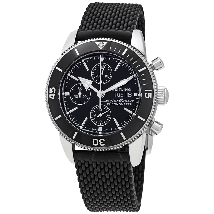 Stainless steel case with a black rubber strap. Uni-directional rotating coin edge stainless steel bezel with a black ceramic ring. Black dial with luminous silver-tone arrow-shaped hands and index hour markers. Minute markers around the outer rim. Dial Type: Analog. Luminescent hands and markers. Day of the week and date display at the 3 o'clock position. Chronograph - three sub-dials displaying: 60 seconds, 30 minutes, and 12 hours. Breitling calibre 13 Automatic movement, based upon ETA Valjoux 7750, containing 25 Jewels, bitting at 28800 vph, and has a power reserve of approximately 42 hours. Scratch resistant sapphire crystal. Screw locked crown. Solid case back. Round case shape. Case size: 44 mm. Case thickness: 15.65 mm. Band width: 22 mm. Fold over clasp with a push button release. Water resistant at 200 meters / 660 feet. Functions: chronograph, date, day, hour, minute, second, chronometer. Superocean Heritage II Series. Luxury watch style. Watch label: Swiss Made. Item Variations: A1331312-BG49-279S-A20D.4. Breitling Superocean Heritage II Chronograph Automatic Chronometer Black Dial Men's Watch A13313121B1S1. INFORMATION Brand: Breitling Series: Superocean Heritage Ii Collection Name: Superocean Heritage II Gender: Mens Model: A13313121B1S1 Watch Label: Swiss Made Movement: Automatic Engine: Breitling Calibre 13 Power Reserve: 70 hours CASE Case Size: 44 mm Case Thickness: 15.65 mm Case Material: Stainless Steel Case Shape: Round Case Back: Solid BAND Band Material: Rubber Band Type: Strap Band Color: Black Band Width: 22 mm Clasp: Fold Over with Push Button Release DIAL Dial Color: Black Type: Analog Crystal: Scratch Resistant Sapphire Hands: Luminous Silver-tone Arrow-shaped Dial Markers: Index Second Markers: Minute Markers around the outer rim Sub Dials: Three - 60 Second, 30 Minute and 12 Hour Luminiscence: Hands and Markers Bezel: Uni-directional Rotating Coin Edge Bezel Color: Black Ceramic Ring Bezel Material: Stainless Steel with a Black Ceramic Ring Crown: Screw Locked FEATURES Water Resistance: 200 meters / 660 feet Calendar: Day of the Week and Date display at the 3 o'clock position Functions: Chronograph, Date, Day, Hour, Minute, Second, Chronometer Watch Features: Analog, Chronometer, Ceramic, Rubber, Stainless Steel, Chronograph ADDITIONAL INFO Watch Style: Luxury Warranty: 2 Year Jomashop Warranty UPC Code: 617566652194 Jomashop Sku: BTA13313121B1S1 Item Variation: A1331312-BG49-279S-A20D.4 Department: Watches Category: Watches