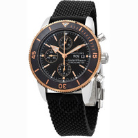 Stainless steel case with a black rubber strap. Uni-directional rotating 18kt rose gold bezel with a black ceramic ring. Black dial with luminous rose gold arrow-shaped hands and index hour markers. Minute markers around the outer rim. Dial Type: Analog. Luminescent hands and markers. Date display at the 3 o'clock position. Chronograph - three sub-dials displaying: 60 seconds, 30 minutes, and 12 hours. Breitling calibre 13 automatic movement, based upon ETA Valjoux 7750, containing 25 Jewels, bitting at 28800 vph, and has a power reserve of approximately 42 hours. Scratch resistant sapphire crystal. Screw locked crown. Solid case back. Round case shape. Case size: 44 mm. Case thickness: 15.65 mm. Band width: 22 mm. Fold over clasp with a push button release. Water resistant at 200 meters / 660 feet. Functions: chronograph, date, hour, minute, second, chronometer. Luxury watch style. Watch label: Swiss Made. Item Variations: U1331312-BG50-279S-A20D.4. Breitling Superocean Heritage II Chronograph Automatic Chronometer Black Dial Men's Watch U13313121B1S1. INFORMATION Brand: Breitling Series: Superocean Heritage Ii Collection Name: Superocean Heritage II Gender: Mens Model: U13313121B1S1 Watch Label: Swiss Made Movement: Automatic Engine: Breitling Calibre 13 Power Reserve: 48 hours CASE Case Size: 44 mm Case Thickness: 15.65 mm Case Material: Stainless Steel Case Shape: Round Case Back: Solid BAND Band Material: Rubber Band Type: Strap Band Color: Black Band Width: 22 mm Clasp: Fold Over with a Push Button Release DIAL Dial Color: Black Type: Analog Crystal: Scratch Resistant Sapphire Hands: Luminous Rose Gold Arrow-shaped Dial Markers: Index Second Markers: Minute Markers around the outer rim Sub Dials: Three - 60 Second, 30 Minute and 12 Hour Luminiscence: Hands and Markers Bezel: Uni-directional Rotating Bezel Material: 18kt Rose Gold and Black Ceramic Crown: Screw Locked FEATURES Water Resistance: 200 meters / 660 feet Calendar: Date display at the 3 o'clock position Functions: Chronograph, Date, Hour, Minute, Second, Chronometer Watch Features: Analog, Chronometer, Ceramic, Gold, Rubber, Stainless Steel, Chronograph ADDITIONAL INFO Watch Style: Luxury Warranty: 2 Year Jomashop Warranty UPC Code: 842047177662 Jomashop Sku: BTU13313121B1S1 Item Variation: U1331312-BG50-279S-A20D.4 Department: Watches Category: Watches