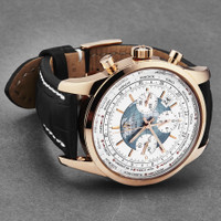 18kt rose gold case with a black crocodile leather strap. Fixed 18kt rose gold bezel. White dial with index hour markers. Minute marker. World time cities around the outer rim. Dial Type: Analog. Luminescent hands and markers. Date display between 4 and 5 o'clock position. Chronograph - three sub-dials displaying: 60 second, 30 minute and 12 hour. Breitling Calibre 05 Automatic movement, based upon Breitling Calibre 01, containing 56 Jewels, bitting at 28800 vph, and has a power reserve of approximately 70 hours. Scratch resistant sapphire crystal. Pull / push crown. Solid case back. Round case shape, case size: 46 mm. Tang clasp. Water resistant at 100 meters / 330 feet. Functions: chronograph, date, GMT, second time zone, hour, minute, second, world time. Transocean Unitime Series. Travel watch style. Watch label: Swiss Made. Breitling Transocean Unitime World Time Chronograph Automatic White Dial Men's Watch RB0510U0/A733LS. GENERAL Box Type: Original Box CASE Case Size: 46 Case Material: 18kt Rose Gold Case Shape: Round Case Back: Solid BAND Band Material: Crocodile Leather Band Type: Strap Band Color: Black Clasp: Tang DIAL Dial Color: White Type: Analog Crystal: Scratch Resistant Sapphire Dial Markers: Index Second Markers: Minute Marker. World Time cities around the outer rim Sub Dials: Three - 60 Second, 30 Minute and 12 Hour Luminiscence: Hands and Markers Bezel: Fixed Bezel Material: 18kt Rose Gold Crown: Pull / Push INFORMATION Brand: Breitling Series: Transocean Unitime Collection Name: Transocean Unitime Gender: Mens Model: RB0510U0/A733LS Watch Label: Swiss Made Movement: Automatic Engine: Breitling Calibre 05 Power Reserve: 70 hours FEATURES Water Resistance: 100 meters / 330 feet Calendar: Date display between 4 and 5 o'clock position Functions: Chronograph, Date, GMT, Second Time Zone, Hour, Minute, Second, World Time Watch Features: Analog, GMT, World Time, Gold, Leather, Chronograph, Time Zone ADDITIONAL INFO Watch Style: Travel Warranty: 2 Year Jomashop Warranty Jomashop Sku: BTRB0510U0A733LS Department: Watches Category: Watches