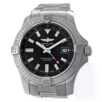 Silver-tone stainless steel case and bracelet. Uni-directional rotating silver-tone stainless steel bezel. Black dial with silver-tone hands and Arabic numeral hour markers. Minute markers around the outer rim. Dial Type: Analog. Luminescent hands and markers. Date display at the 3 o'clock position. Breitling Calibre 17 Automatic movement, based upon ETA 2824-2, containing 25 Jewels, bitting at 28800 vph, and has a power reserve of approximately 42 hours. Screw down crown. Solid case back. Round case shape, case size: 42 mm. Fold over clasp with a safety release. Water resistant at 300 meters / 1000 feet. Functions: date, hour, minute, second, chronometer. Avenger Series. Dive watch style. Watch label: Swiss Made. Pre-owned Breitling Avenger Automatic Chronometer Black Dial Men's Watch A17318. GENERAL Collection Name: Avenger INFORMATION Brand: Breitling Series: Avenger Model: A17318 Gender: Mens Watch Label: Swiss Made Movement: Automatic Engine: Breitling Calibre 17 Power Reserve: 42 hours CONDITION INFORMATION Box: Yes Preowned Item Condition: Mint Papers: Yes Comments: The watch is in near to mint condition with no visible scratches to the naked eye but may have some tiny scratches under close-up inspection. The only exception is the small scratches on the back case. The watch comes with full set - box, warranty card, chronometer certificate, appraisal certificate, and instructions booklet. The watch passed the water pressure test and we will include the printout of the test results. Fits the wrist up to 7.25 inches. The automatic movement is in good working o CASE Case Size: 42 Case Material: Stainless Steel Case Shape: Round Case Back: Solid DIAL Type: Analog Dial Color: Black Hands: Silver-tone Second Markers: Minute Markers around the outer rim Dial Markers: Arabic Numeral Luminiscence: Hands and Markers Bezel: Uni-directional Rotating Bezel Color: Silver-tone Bezel Material: Stainless Steel Crown: Screw Down BAND Band Type: Bracelet Band Material: Stainless Steel Band Color: Silver-tone Clasp: Fold Over with Safety Release FEATURES Water Resistance: 300 meters / 1000 feet Calendar: Date display at the 3 o'clock position Functions: Date, Hour, Minute, Second, Chronometer Watch Features: Analog, Chronometer, Stainless Steel ADDITIONAL INFO Watch Style: Dive Warranty: 1 Year Jomashop Warranty Jomashop Sku: PRE-P-BT84396 Department: Watches