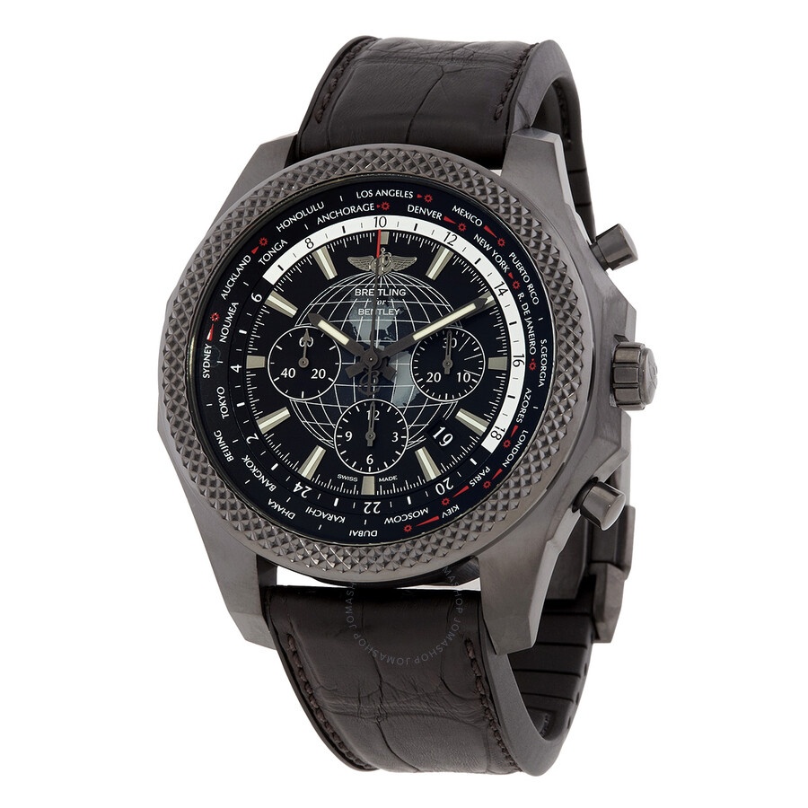 Pre-owned Black stainless steel case with a black rubber strap. Fixed black stainless steel bezel. Black (globe) dial with luminous grey hands and index hour markers. Minute markers. 24 hour markers. World time cities around the outer rim. Dial Type: Analog. Luminescent hands and markers. Date display between the 4 and 5 o'clock positions. Chronograph - three sub-dials displaying: 60 second, 30 minute and 12 hour. Breitling calibre 05 automatic movement, based upon Breitling calibre 01, containing 56 Jewels, bitting at 28800 vph, and has a power reserve of approximately 70 hours. Scratch resistant sapphire crystal. Screw locked crown. Transparent case back. Round case shape. Case size: 49 mm. Case thickness: 17 mm. Band width: 24 mm. Deployment clasp. Water resistant at 100 meters / 330 feet. Functions: chronograph, column wheel, world time, date, hour, minute, small second, chronometer. Additional Info: limited to 500. Bentley Series. Travel watch style. Watch label: Swiss Made. Breitling Bentley World Time Chronograph Automatic Chronometer Black Dial Men's Watch MB0521V4/BE46-244S. GENERAL Collection Name: Bentley INFORMATION Brand: Breitling Series: Bentley Model: MB0521V4/BE46-244S.M20DSA.4 Gender: Mens Watch Label: Swiss Made Movement: Automatic Engine: Breitling Calibre 05 Power Reserve: 70 hours CONDITION INFORMATION Box: Yes Preowned Item Condition: Unworn / Like New Papers: Yes CASE Case Size: 49 mm Case Thickness: 17 mm Case Material: Stainless Steel Case Shape: Round Case Back: Transparent DIAL Type: Analog Dial Color: Black (Globe) Crystal: Scratch Resistant Sapphire Hands: Luminous Grey Second Markers: Minute Markers. 24 Hour Markers. World Time Cities around the outer rim Dial Markers: Index Sub Dials: Three - 60 Second, 30 Minute and 12 Hour Luminiscence: Hands and Markers Bezel: Fixed Bezel Color: Black Bezel Material: Stainless Steel Crown: Screw Locked BAND Band Type: Strap Band Material: Rubber Band Color: Black Band Width: 24 mm Clasp: Deployment FEATURES Water Resistance: 100 meters / 330 feet Calendar: Date display between the 4 and 5 o'clock positions Functions: Chronograph, Column Wheel, World Time, Date, Hour, Minute, Small Second, Chronometer Watch Features: Analog, Chronometer, World Time, Rubber, Stainless Steel, Chronograph ADDITIONAL INFO Watch Style: Travel Warranty: 1 Year Jomashop Warranty UPC Code: 842047188590 Additional Info: Limited to 500 Jomashop Sku: PRE-P-BT55125 Department: Watches Category: Watches