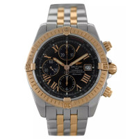 Silver-tone stainless steel case with a two-tone (silver-tone and rose gold-tone) 18kt rose gold and stainless steel bracelet. Uni-directional rotating rose gold-tone 18kt rose gold bezel. Black dial with rose gold-tone hands and Arabic numeral & index hour markers. Minute markers around the outer rim. Dial Type: Analog. Luminescent hands and markers. Date display at the 3 o'clock position. Chronograph - three sub-dials displaying: 60 second, 30 minute and 12 hour. Breitling Calibre 13 Automatic movement, based upon ETA Valjoux 7750, containing 25 Jewels, bitting at 28800 vph, and has a power reserve of approximately 42 hours. Scratch resistant sapphire crystal. Screw down crown. Solid case back. Round case shape, case size: 44 mm. Fold over clasp with a safety release. Water resistant at 300 meters / 1000 feet. Functions: chronograph, date, hour, minute, second, chronometer. C13356 Series. Dive watch style. Watch label: Swiss Made. Pre-owned Breitling C13356 Chronograph Automatic Chronometer Black Dial Men's Watch C13356. GENERAL Collection Name: C13356 INFORMATION Brand: Breitling Series: C13356 Model: C13356 Gender: Mens Watch Label: Swiss Made Movement: Automatic Engine: Breitling Calibre 13 Power Reserve: 42 hours CONDITION INFORMATION Box: Yes Preowned Item Condition: Mint Papers: Yes CASE Case Size: 44 Case Material: Stainless Steel Case Shape: Round Case Back: Solid DIAL Type: Analog Dial Color: Black Crystal: Scratch Resistant Sapphire Hands: Rose Gold-tone Second Markers: Minute Markers around the outer rim Dial Markers: Arabic Numeral & Index Sub Dials: Three - 60 Second, 30 Minute and 12 Hour Luminiscence: Hands and Markers Bezel: Uni-directional Rotating Bezel Color: Rose Gold-tone Bezel Material: 18kt Rose Gold Crown: Screw Down BAND Band Type: Bracelet Band Material: 18kt Rose Gold and Stainless Steel Band Color: Two-tone (Silver-tone and Rose Gold-tone) Clasp: Fold Over with Safety Release FEATURES Water Resistance: 300 meters / 1000 feet Calendar: Date display at the 3 o'clock position Functions: Chronograph, Date, Hour, Minute, Second, Chronometer Watch Features: Analog, Chronometer, Gold, Stainless Steel, Chronograph ADDITIONAL INFO Watch Style: Dive Warranty: 1 Year Jomashop Warranty Jomashop Sku: PRE-P-BT88068 Department: Watches
