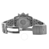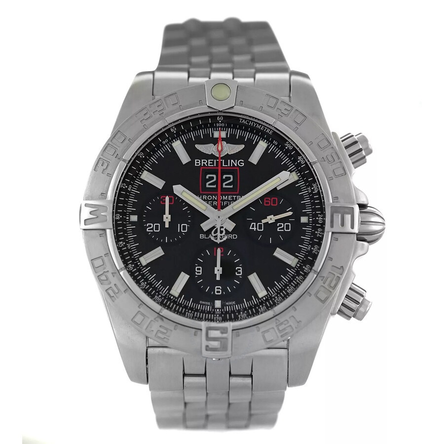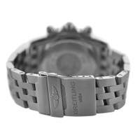 Silver-tone stainless steel case and bracelet. Bi-directional rotating silver-tone stainless steel bezel. Black dial with silver-tone hands and Arabic numeral & index hour markers. Minute markers around the outer rim. Dial Type: Analog. Luminescent hands and markers. Date display at the 12 o'clock position. Chronograph - three sub-dials displaying: 60 second, 30 minute and 12 hour. Breitling Calibre 44 Automatic movement, based upon ETA 2892-A2, containing 21 Jewels, bitting at 28800 vph, and has a power reserve of approximately 42 hours. Scratch resistant sapphire crystal. Screw down crown. Solid case back. Round case shape, case size: 44 mm. Fold over clasp with a safety release. Water resistant at 300 meters / 1000 feet. Functions: chronograph, big date, hour, minute, second, chronometer. Chronomat Blackbird Series. Dive watch style. Watch label: Swiss Made. Pre-owned Breitling Chronomat Blackbird Chronograph Automatic Chronometer Black Dial Men's Watch A44360. GENERAL Collection Name: Chronomat Blackbird INFORMATION Brand: Breitling Series: Chronomat Model: A44360 Gender: Mens Watch Label: Swiss Made Movement: Automatic Engine: Breitling Calibre 44 Power Reserve: 42 hours CONDITION INFORMATION Box: No Preowned Item Condition: Excellent Papers: No CASE Case Size: 44 Case Material: Stainless Steel Case Shape: Round Case Back: Solid DIAL Type: Analog Dial Color: Black Crystal: Scratch Resistant Sapphire Hands: Silver-tone Second Markers: Minute Markers around the outer rim Dial Markers: Arabic Numeral & Index Sub Dials: Three - 60 Second, 30 Minute and 12 Hour Luminiscence: Hands and Markers Bezel: Bi-directional Rotating Bezel Color: Silver-tone Bezel Material: Stainless Steel Crown: Screw Down BAND Band Type: Bracelet Band Material: Stainless Steel Band Color: Silver-tone Clasp: Fold Over with Safety Release FEATURES Water Resistance: 300 meters / 1000 feet Calendar: Date display at the 12 o'clock position Functions: Chronograph, Big Date, Hour, Minute, Second, Chronometer Watch Features: Analog, Chronometer, Stainless Steel, Chronograph ADDITIONAL INFO Watch Style: Dive Warranty: 1 Year Jomashop Warranty Jomashop Sku: PRE-P-BT88740 Department: Watches