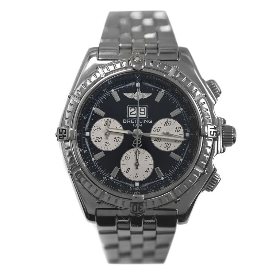 Silver-tone stainless steel case and bracelet. Silver-tone stainless steel bezel. Black dial with silver-tone hands and Arabic numeral & index hour markers. Minute markers around the outer rim. Dial Type: Analog. Luminescent hands and markers. Date display at the 12 o'clock position. Three sub-dials displaying: 60 second, 30 minute and moonphase. Breitling Calibre 43 automatic movement with a 46-hour power reserve. Solid case back. Round case shape, case size: 44 mm. Band length: 8.25 inches. Fold over clasp with a safety release. Water resistant at 100 meters / 330 feet. Functions: moon phase, chronograph, date, hour, minute, second. Crosswind Series. Luxury watch style. Watch label: Swiss Made. Pre-owned Breitling Crosswind Chronograph Automatic Moon Phase Black Dial Men's Watch A43355. GENERAL Collection Name: Crosswind INFORMATION Brand: Breitling Series: Crosswind Model: A43355 Gender: Mens Watch Label: Swiss Made Movement: Automatic Engine: Breitling Calibre 43 Power Reserve: 46 hours CONDITION INFORMATION Box: No Preowned Item Condition: Excellent Papers: No Comments: The watch is in excellent condition with no visible scratches to the naked eye buy might have some micro scratches that are visible under a very close-up inspection. The watch passed the water pressure test and we will include the printout of the test results. The automatic movement is in good working order and keeps time within standards. Fits the wrist up to 8.5 inches. The serial and model numbers are presented and visible on the back case. Authenticity is 100% guaranteed. CASE Case Size: 44 Case Material: Stainless Steel Case Shape: Round Case Back: Solid DIAL Type: Analog Dial Color: Black Hands: Silver-tone Second Markers: Minute Markers around the outer rim Dial Markers: Arabic Numeral & Index Sub Dials: Three - 60 Second, 30 Minute and Moonphase Luminiscence: Hands and Markers Bezel Color: Silver-tone Bezel Material: Stainless Steel BAND Band Type: Bracelet Band Material: Stainless Steel Band Color: Silver-tone Band Length: 8.25 inches Clasp: Fold Over with Safety Release FEATURES Water Resistance: 100 meters / 330 feet Calendar: Date display at the 12 o'clock position Functions: Moon Phase, Chronograph, Date, Hour, Minute, Second Watch Features: Analog, Stainless Steel, Moon Phase, Chronograph ADDITIONAL INFO Watch Style: Luxury Warranty: 1 Year Jomashop Warranty Jomashop Sku: PRE-P-BT79173 Department: Watches
