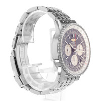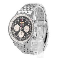 Silver-tone stainless steel case and bracelet. Bi-directional rotating silver-tone stainless steel bezel. Black dial with silver-tone hands and index hour markers. Minute markers around the outer rim. Dial Type: Analog. Luminescent hands and markers. Date display between 4 and 5 o'clock position. Chronograph - three sub-dials displaying: 60 second, 30 minute and 12 hour. Breitling Calibre 01 Automatic movement, containing 47 Jewels, composed of 346 parts, bitting at 28800 vph, and has a power reserve of approximately 70 hours. Scratch resistant sapphire crystal. Pull / push crown. Solid case back. Round case shape, case size: 43 mm. Fold over clasp with a safety release. Water resistant at 30 meters / 100 feet. Functions: chronograph, column wheel, date, hour, minute, second, chronometer. Navitimer 01 Series. Luxury watch style. Watch label: Swiss Made. Pre-owned Breitling Navitimer 01 Chronograph Automatic Chronometer Black Dial Men's Watch AB0120. GENERAL Year: Circa 2015 Comments: This Breitling Navitimer 01, reference number AB0120, has a manufacturer year of Circa 2015. Box not included, Papers not included . This watch has a 43mm Steel Case with Steel bezel, Black Index numerals dial and Steel bracelet with Fold clasp. The Automatic movement has Chronograph function. The wrist measures 7 inches or 17.78 centimeters. The condition is Very Good The watch listed is in stock and the pictures shown are of the actual watch for sale. All of our watches have been thoroughly c Preowned Item Condition: Very Good CASE Case Material: Stainless Steel Case Shape: Round Case Back: Solid BAND Band Material: Stainless Steel Band Type: Bracelet Band Color: Silver-tone Clasp: Fold Over with Safety Release DIAL Dial Color: Black Type: Analog Crystal: Scratch Resistant Sapphire Hands: Silver-tone Dial Markers: Index Second Markers: Minute Markers around the outer rim Sub Dials: Three - 60 Second, 30 Minute and 12 Hour Luminiscence: Hands and Markers Bezel: Bi-directional Rotating Bezel Color: Silver-tone Bezel Material: Stainless Steel Crown: Pull / Push INFORMATION Brand: Breitling Series: Navitimer Collection Name: Navitimer 01 Gender: Mens Model: AB0120 Watch Label: Swiss Made Movement: Automatic Engine: Breitling Calibre 01 Power Reserve: 70 hours FEATURES Water Resistance: 30 meters / 100 feet Calendar: Date display between 4 and 5 o'clock position Functions: Chronograph, Column Wheel, Date, Hour, Minute, Second, Chronometer Watch Features: Analog, Chronometer, Stainless Steel, Chronograph ADDITIONAL INFO Watch Style: Luxury Warranty: 1 Year Jomashop Warranty Jomashop Sku: PRE-P-BT104694 Department: Watches Category: Watches