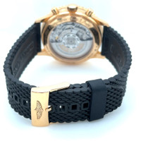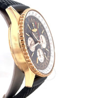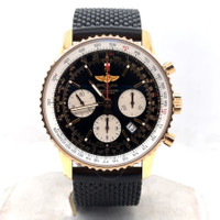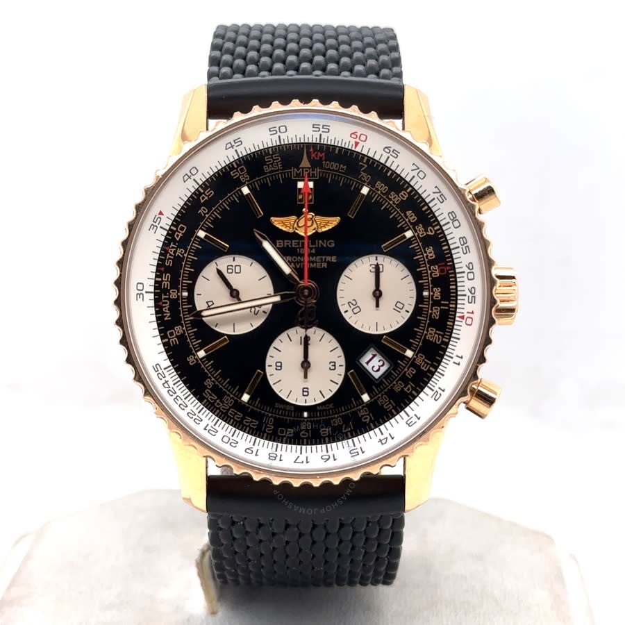 Rose gold-tone 18kt rose gold case with a black rubber strap. Bi-directional rotating rose gold-tone 18kt rose gold bezel. Black dial with rose gold-tone hands and index hour markers. Minute markers around the outer rim. Dial Type: Analog. Luminescent hands and markers. Date display between 4 and 5 o'clock position. Chronograph - three sub-dials displaying: 60 second, 30 minute and 12 hour. Breitling Calibre 01 Automatic movement, containing 47 Jewels, composed of 346 parts, bitting at 28800 vph, and has a power reserve of approximately 70 hours. Scratch resistant sapphire crystal. Pull / push crown. Transparent case back. Round case shape, case size: 43 mm, case thickness: 14 mm. Band width: 20 mm. Buckle clasp. Water resistant at 30 meters / 100 feet. Functions: chronograph, column wheel, date, hour, minute, second, chronometer. Navitimer Series. Luxury watch style. Watch label: Swiss Made. Pre-owned Breitling Navitimer Chronograph Automatic Chronometer Black Dial Men's Watch RB0121. GENERAL Collection Name: Navitimer INFORMATION Brand: Breitling Series: Navitimer Model: RB0121 Gender: Mens Watch Label: Swiss Made Movement: Automatic Engine: Breitling Calibre 01 Power Reserve: 70 hours CONDITION INFORMATION Box: No Preowned Item Condition: Excellent Papers: No CASE Case Size: 43 Case Thickness: 14 mm Case Material: 18kt Rose Gold Case Shape: Round Case Back: Transparent DIAL Type: Analog Dial Color: Black Crystal: Scratch Resistant Sapphire Hands: Rose Gold-tone Second Markers: Minute Markers around the outer rim Dial Markers: Index Sub Dials: Three - 60 Second, 30 Minute and 12 Hour Luminiscence: Hands and Markers Bezel: Bi-directional Rotating Bezel Color: Rose Gold-tone Bezel Material: 18kt Rose Gold Crown: Pull / Push BAND Band Type: Strap Band Material: Rubber Band Color: Black Band Width: 20 mm Clasp: Buckle FEATURES Water Resistance: 30 meters / 100 feet Calendar: Date display between 4 and 5 o'clock position Functions: Chronograph, Column Wheel, Date, Hour, Minute, Second, Chronometer Watch Features: Analog, Chronometer, Gold, Rubber, Chronograph ADDITIONAL INFO Watch Style: Luxury Warranty: 1 Year Jomashop Warranty Jomashop Sku: PRE-P-BT82692 Department: Watches