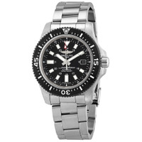 Pre-owned Stainless steel case and bracelet. Uni-directional rotating black ceramic bezel. Black dial with index hour markers. Dial Type: Analog. Date display at the 3 o'clock position. Breitling Calibre 17 Automatic movement, based upon ETA 2824-2, containing 25 Jewels, bitting at 28800 vph, and has a power reserve of approximately 42 hours. Scratch resistant sapphire crystal. Screw down crown. Solid case back. Round case shape, case size: 44 mm. Deployment clasp. Water resistant at 1000 meters / 3300 feet. Functions: date, hour, minute, second, chronometer. Superocean Series. Sport watch style. Watch label: Swiss Made. Breitling Superocean 44 Special Automatic Chronometer Black Dial Men's Watch Y17393101B1A1. GENERAL Year: 2017 Preowned Item Condition: Very Good CASE Case Material: Stainless Steel Case Shape: Round Case Back: Solid BAND Band Material: Stainless Steel Band Type: Bracelet Band Color: Silver-tone Clasp: Deployment DIAL Dial Color: Black Type: Analog Crystal: Scratch Resistant Sapphire Hands: Silver-tone Dial Markers: Index Second Markers: Minute Markers around the outer rim Bezel: Uni-directional Rotating Bezel Color: Black Bezel Material: Ceramic Crown: Screw Down INFORMATION Brand: Breitling Series: Superocean Collection Name: Superocean Gender: Mens Model: Y17393101B1A1 Watch Label: Swiss Made Movement: Automatic Engine: Breitling Calibre 17 Power Reserve: 42 hours FEATURES Water Resistance: 1000 meters / 3300 feet Calendar: Date display at the 3 o'clock position Functions: Date, Hour, Minute, Second, Chronometer Watch Features: Analog, Chronometer, Ceramic, Stainless Steel ADDITIONAL INFO Watch Style: Sport Warranty: 1 Year Jomashop Warranty Jomashop Sku: PRE-P-BT104610 Department: Watches Category: Watches