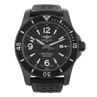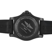 Black stainless steel case with a black rubber strap. Uni-directional rotating black stainless steel bezel. Black dial with black hands and Arabic numeral & index hour markers. Minute markers around the outer rim. Dial Type: Analog. Luminescent hands and markers. Date display at the 3 o'clock position. Breitling Calibre 17 Automatic movement, based upon ETA 2824-2, containing 25 Jewels, bitting at 28800 vph, and has a power reserve of approximately 42 hours. Scratch resistant sapphire crystal. Screw down crown. Solid case back. Round case shape, case size: 46 mm. Buckle clasp. Water resistant at 2000 meters / 6600 feet. Functions: date, hour, minute, second, chronometer. Superocean Series. Dive watch style. Watch label: Swiss Made. Pre-owned Breitling Superocean Automatic Chronometer Black Dial Men's Watch M17368. GENERAL Comments: This was in excellent condition, but may have a few micro spots on the PVD surface. This watch passed the water pressure test, and we will include the printout of the test results. The strap is worn but still in excellent condition, without cracks or rips. The automatic movement keeps time within standards, and all the functions are in perfect working order. Fits the wrist up to 8.25 inches. The serial and model numbers are visible on the back of the case. The authenticity is 100% guaranteed. Preowned Item Condition: Excellent CASE Case Material: Stainless Steel Case Shape: Round Case Back: Solid BAND Band Material: Rubber Band Type: Strap Band Color: Black Clasp: Buckle DIAL Dial Color: Black Type: Analog Crystal: Scratch Resistant Sapphire Hands: Black Dial Markers: Arabic Numeral & Index Second Markers: Minute Markers around the outer rim Luminiscence: Hands and Markers Bezel: Uni-directional Rotating Bezel Color: Black Bezel Material: Stainless Steel Crown: Screw Down INFORMATION Brand: Breitling Series: Superocean Collection Name: Superocean Gender: Mens Model: M17368 Watch Label: Swiss Made Movement: Automatic Engine: Breitling Calibre 17 Power Reserve: 42 hours FEATURES Water Resistance: 2000 meters / 6600 feet Calendar: Date display at the 3 o'clock position Functions: Date, Hour, Minute, Second, Chronometer Watch Features: Analog, Chronometer, Rubber, Stainless Steel ADDITIONAL INFO Watch Style: Dive Warranty: 1 Year Jomashop Warranty Jomashop Sku: PRE-P-BT101226 Department: Watches Category: Watches