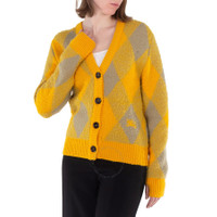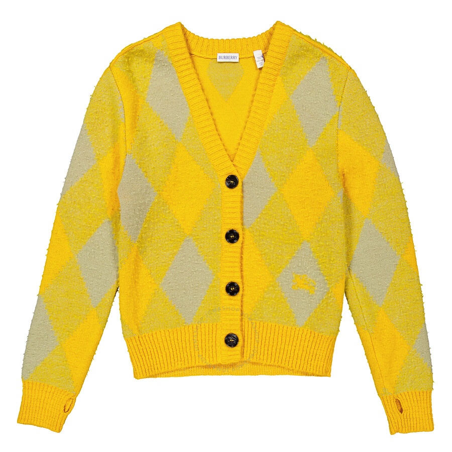 Burberry Ladies Tops. Fashion category: Cardigans & Sweaters. SKU: 8077684. Color: Mimosa Ip Pattern. Burberry Argyle Diamond Patterned Rib Trim Cardigan. This cardigan features a front button closure and is made from midweight knit fabric with ribbed trims and a diamond pattern. 100% Wool. Made in Italy. GENERAL Color: Mimosa Ip Pattern INFORMATION Brand: Burberry Gender: Womens Model: 8077684 DETAILS Category: Tops Apparel Type: Cardigans & Sweaters Material: Wool ADDITIONAL INFO Jomashop Sku: -8077684N Department: Clothing