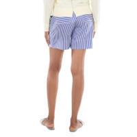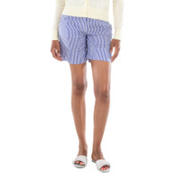 Burberry Ladies Bottoms. Fashion category: Shorts. SKU: 8072579. Color: Blue/White Stripe. Burberry Asian Version Striped Silk Quality Shorts. These Asian Version Striped Silk Quality Shorts feature a relaxed fit with bold, new-season stripes and contrasting side panels. The design includes a hidden hook-and-loop fastener, button, and zip fly for a seamless look. Additional details include side slip pockets and a back patch pocket for added functionality. 100% silk. Made in Italy. GENERAL Brand Type: Designer Color: Blue/White Stripe INFORMATION Brand: Burberry Gender: Womens Model: 8072579 DETAILS Category: Bottoms Apparel Type: Shorts Material: Silk ADDITIONAL INFO Jomashop Sku: -8072579N Department: Clothing