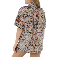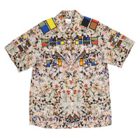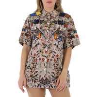 Burberry Ladies Tops. Fashion category: Casual Button-Downs. SKU: 8042239. Color: Beige Ip Pttn. Burberry Badge Appliques Iris Floral-Print Silk Crepe De Chine Oversized Shirt. This shirt is crafted from 100% mulberry silk and features a relaxed silhouette with a classic spread collar, a front button-down closure, short sleeves, colorful applique details throughout the shoulders, sleeves, and chest. GENERAL Color: Beige Ip Pttn INFORMATION Brand: Burberry Gender: Womens Model: 8042239 DETAILS Category: Tops Apparel Type: Casual Button-Downs Material: Silk ADDITIONAL INFO Jomashop Sku: -8042239N Department: Apparel
