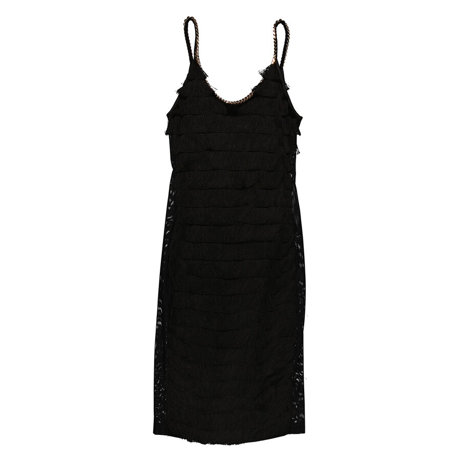 Burberry Ladies Dresses. Fashion category: Cocktail & Party Dresses. SKU: 8062810. Color: Black. Burberry Black Melina Sleeveless Chain Trim Fringed Dress. This sleeveless dress is crafted from stretch-infused viscose woven fabric, featuring mesh side panels and a polished chain detail at the neckline. It is finished with a concealed back hook-and-eye and zip closure. 98% viscose, 2% elastane. Made in Italy. GENERAL Color: Black INFORMATION Brand: Burberry Gender: Womens Model: 8062810 DETAILS Category: Dresses Apparel Type: Cocktail & Party Dresses Material: Elastane, Viscose ADDITIONAL INFO Jomashop Sku: -8062810N Department: Apparel