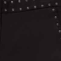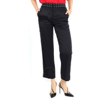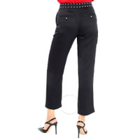 Burberry Ladies Bottoms. Fashion category: Pants & Leggings. SKU: 8014275. Color: Black. Burberry Black Silk Satin Studded Tailored Trousers. This straight-fit trousers in silk satin, featuring a button and zip fly closure, concealed hook-and-bar, side slip pockets, back button-through welt pockets and tailored with a sharp front crease and framed with silver-tone studs. Materials - Outer: 100% Mulberry silk. Lining: 100% viscose. Made in Italy. GENERAL Upper Material: Silk Upper Material: Silk Color: Black INFORMATION Brand: Burberry Gender: Womens Model: 8014275 DETAILS Category: Bottoms Apparel Type: Pants & Leggings ADDITIONAL INFO Jomashop Sku: -8014275N Department: Apparel