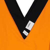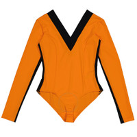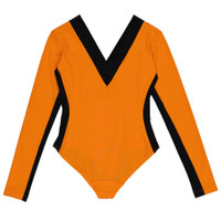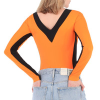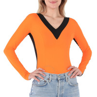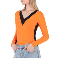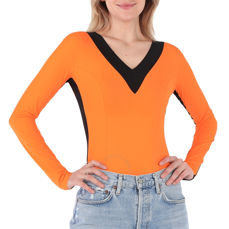 Burberry Ladies Tops. SKU: 4560597. Color: Bright Orange. Burberry Bright Orange V-neck Bodysuit. This bodysuit features a deep-v neckline, long sleeves, and stripe details. Made in Italy. GENERAL Color: Bright Orange INFORMATION Brand: Burberry Gender: Womens Model: 4560597 DETAILS Category: Tops Apparel Type: Bodysuits ADDITIONAL INFO Jomashop Sku: -4560597N Department: Apparel