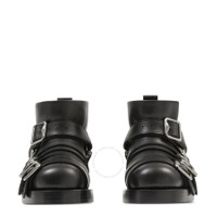 Burberry Ladies Boots. SKU: 8077201. Color: Black. Burberry Buckled Leather Biker Boots. A pair of leather biker boots featuring buckle detail at the toe, buckled harness strap detailing, and silver-tone hardware. These ankle-length boots have a round toe, slip-on style, pull-tab at the heel, a low block heel, and a leather outsole for durability. Leather 100% Made in Italy. Please visit the brand website for sizing information. GENERAL Brand Type: Designer INFORMATION Brand: Burberry Model: 8077201 Gender: Womens DETAILS Category: Boots Shoe Style: Ankle boots Shoe Style: Ankle boots Color: Black Shoe Vamp Style: Slip-on Upper Material: Leather Sole Material: Leather ADDITIONAL INFO Jomashop Sku: -8077201N Department: Shoes