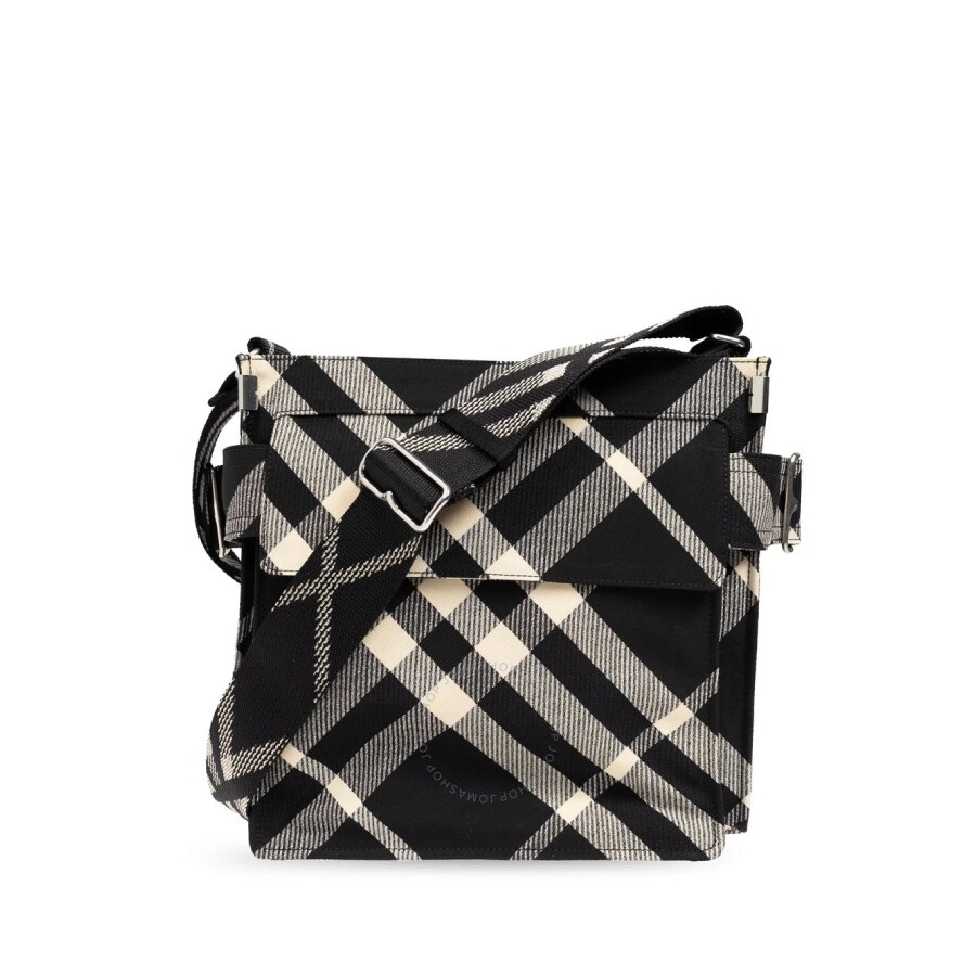 Burberry Men's Tote. SKU: 8091822. Material: Cotton;Polyester. Color: Black/Calico. Size: H:29cm x W:29cm x D:8.5cm. Burberry Checked Trench Shoulder Bag. This shoulder bag is made of canvas with silver-colored fittings, featuring a logo buckle, an adjustable shoulder strap, front flap pockets, and a major interior zip pocket. 65% Polyester, 35% Cotton. Made in Italy. GENERAL Size Info: H:29cm x W:29cm x D:8.5cm Color: Black/Calico INFORMATION Brand: Burberry Gender: Mens Model: 8091822 DETAILS Material: Cotton, Polyester ADDITIONAL INFO UPC Code: 5045706628009 Jomashop Sku: Z-BJ8F7 Department: Bags Category: Tote Bags