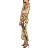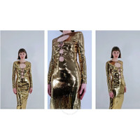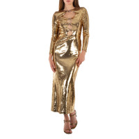 Burberry Ladies Dresses. SKU: 8062969. Color: Gold. The Corrine dress by Burberry is a standout piece featuring reflective sequin embellishments that add a glamorous shine. It boasts a fitted bodice with cut-out details, enhancing its modern and daring look, while the flowing, floor-length skirt provides elegance and movement. The dress has a round neck and long sleeves, giving it a sophisticated yet edgy vibe. Made of 100% viscose, the Corrine dress offers comfort and a luxurious feel. It's designed in Italy. This piece captures Burberry's refined craftsmanship combined with a contemporary touch through the cut-out and embellishment details. 97%Mulberry Silk 3%Elastane. GENERAL Color: Gold INFORMATION Brand: Burberry Gender: Womens Model: 8062969 DETAILS Category: Dresses ADDITIONAL INFO Jomashop Sku: -8062969N Department: Clothing